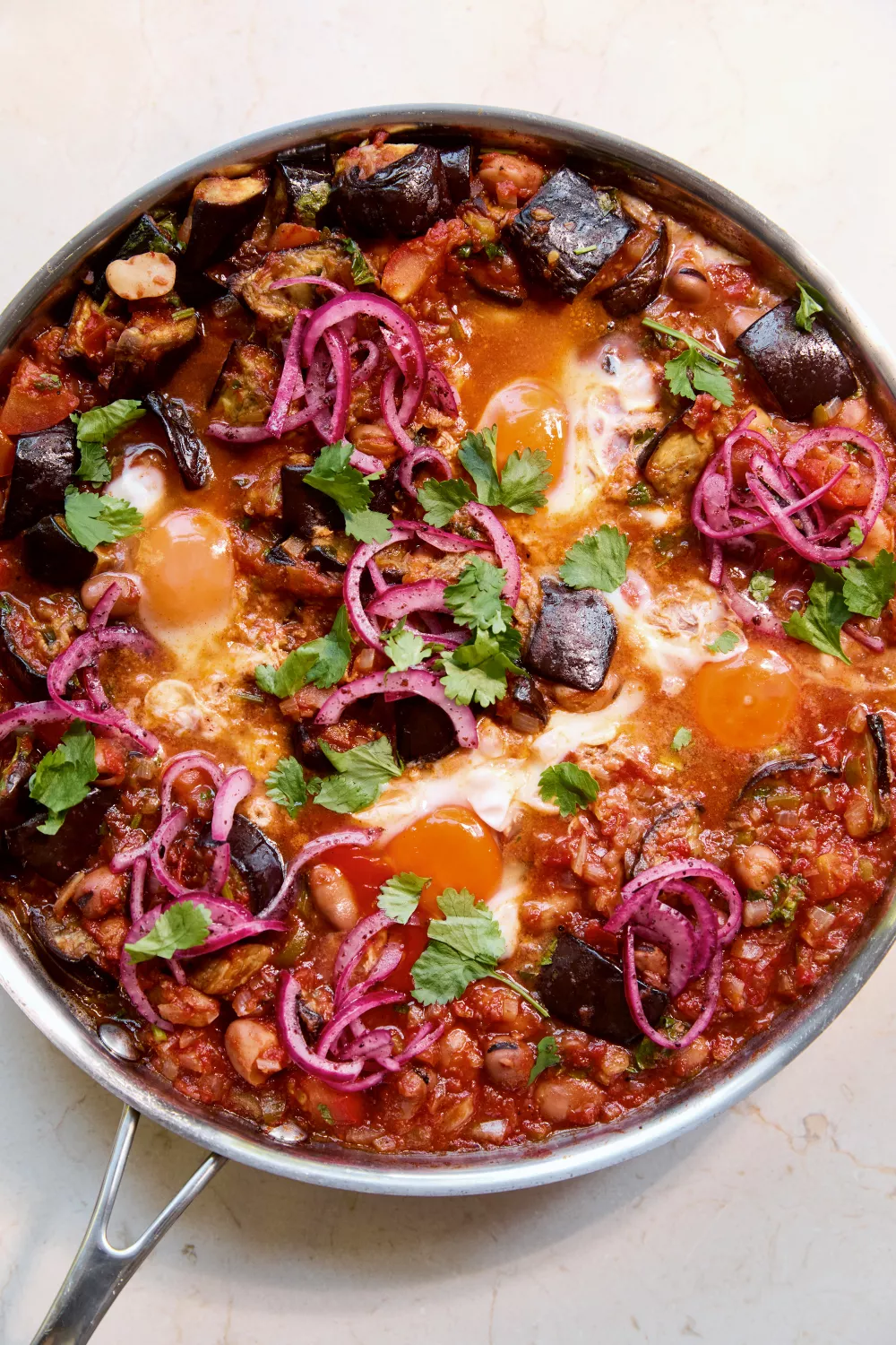 Geroosterde aubergines en zachte tuinbonen smelten samen in een kruidige tomatensaus waarin eieren zacht gepocheerd worden tot een smeuïg geheel. De warminge combinatie van komijn, kaneel en chili geeft dit mediterraans getinte stoofgerecht diepte en karakter, ideaal voor een stevige lunch of gezellige herfstmaaltijd. Simpel te maken met ovenroosteren en sudderen op het fornuis voor pure huiselijke smaak.