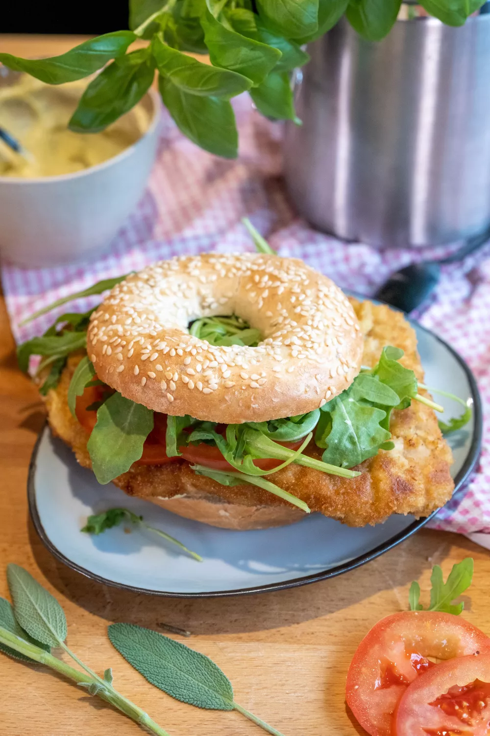 Een krokante bagel met dunne, gepaneerde kalfslapjes en frisse citroenmayonaise combineert Italiaanse finesse met snelle panbaktechniek voor een smaakvolle lunch of lichte avondmaaltijd. Goudbruin gebakken vlees, sappige tomaat en pittige rucola zorgen voor een knapperige textuur en zomerse frisheid. Ideaal voor liefhebbers van paneerwerk, comfort food en eenvoudige seizoensingrediënten.