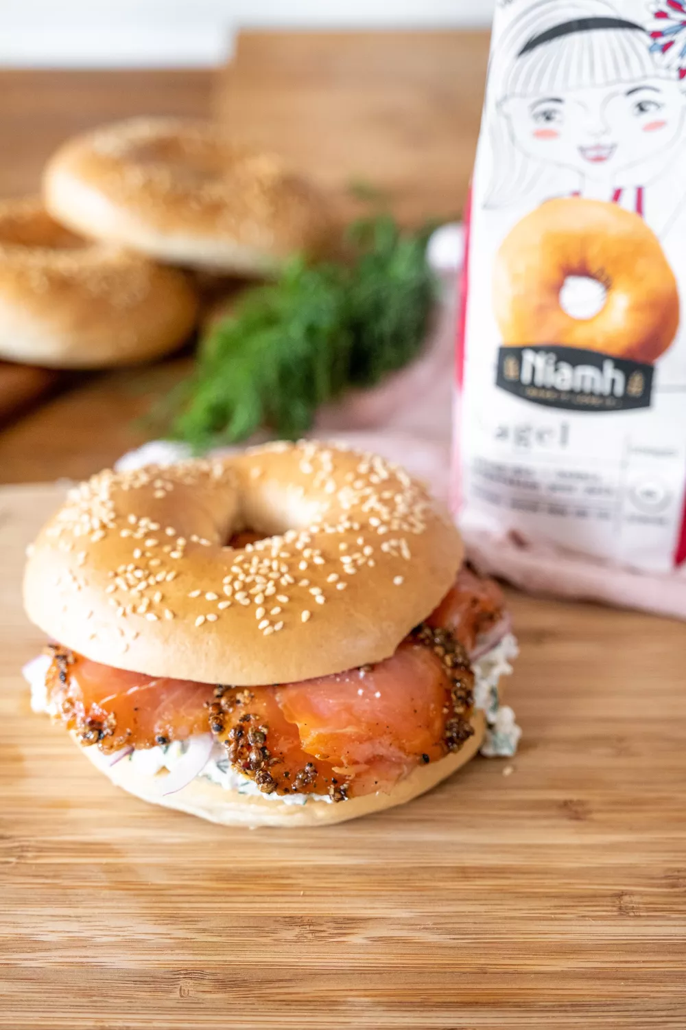 Breng een grote pot met water aan de kook op het vuur. Dompel van zodra het water kookt, de bagels één voor één gedurende 30 seconden onder. Draai de bagel om en dompel nog eens 30 seconden onder. Leg de bagels op een met bakpapier bedekte bakplaat en bestrooi ze met sesamzaadjes. Bak de bagels 20 minuten in de oven op 200 graden.