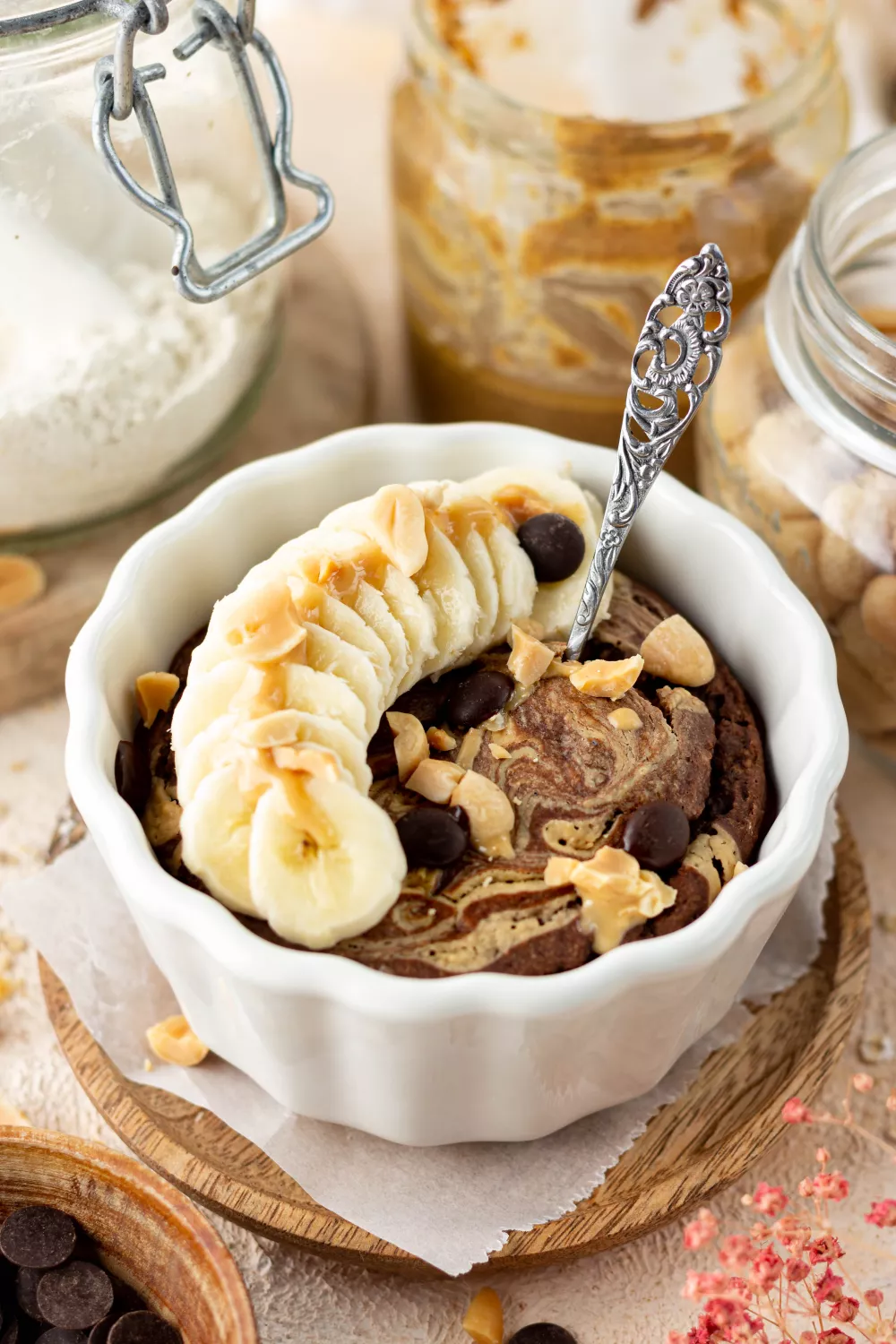 Verdeel het beslag over een klein ovenbestendig schaaltje en verdeel de pindakaas over de bovenkant.Bak voor 15-20 minuten op 200 graden in een hete lucht oven.