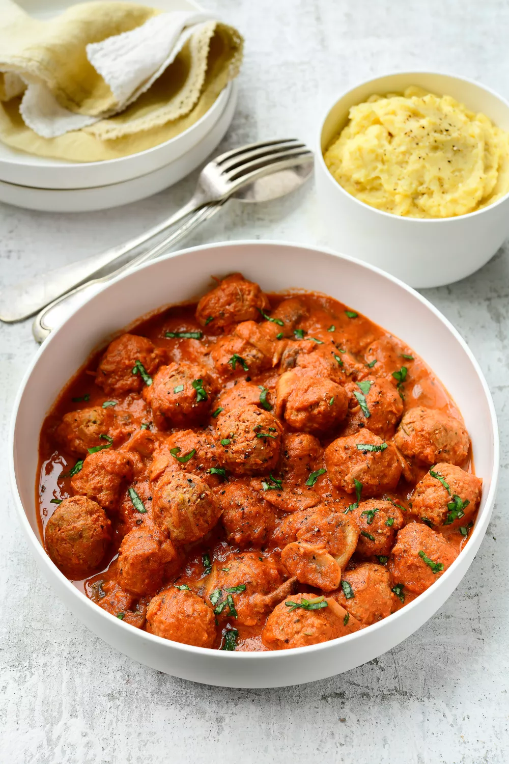 Smeuïge gehaktballetjes in een romige tomatensaus met extra groenten en champignons bieden een geruststellend huiselijk gerecht voor doordeweekse avonden. Gehakt gemengd met geraspte wortel en courgette wordt goudbruin gebakken en vervolgens gestoofd in passata en culinaire room, terwijl zachte aardappelpuree met nootmuskaat het geheel afmaakt. Perfect comfortfood om met familie te delen in de herfst of winter.