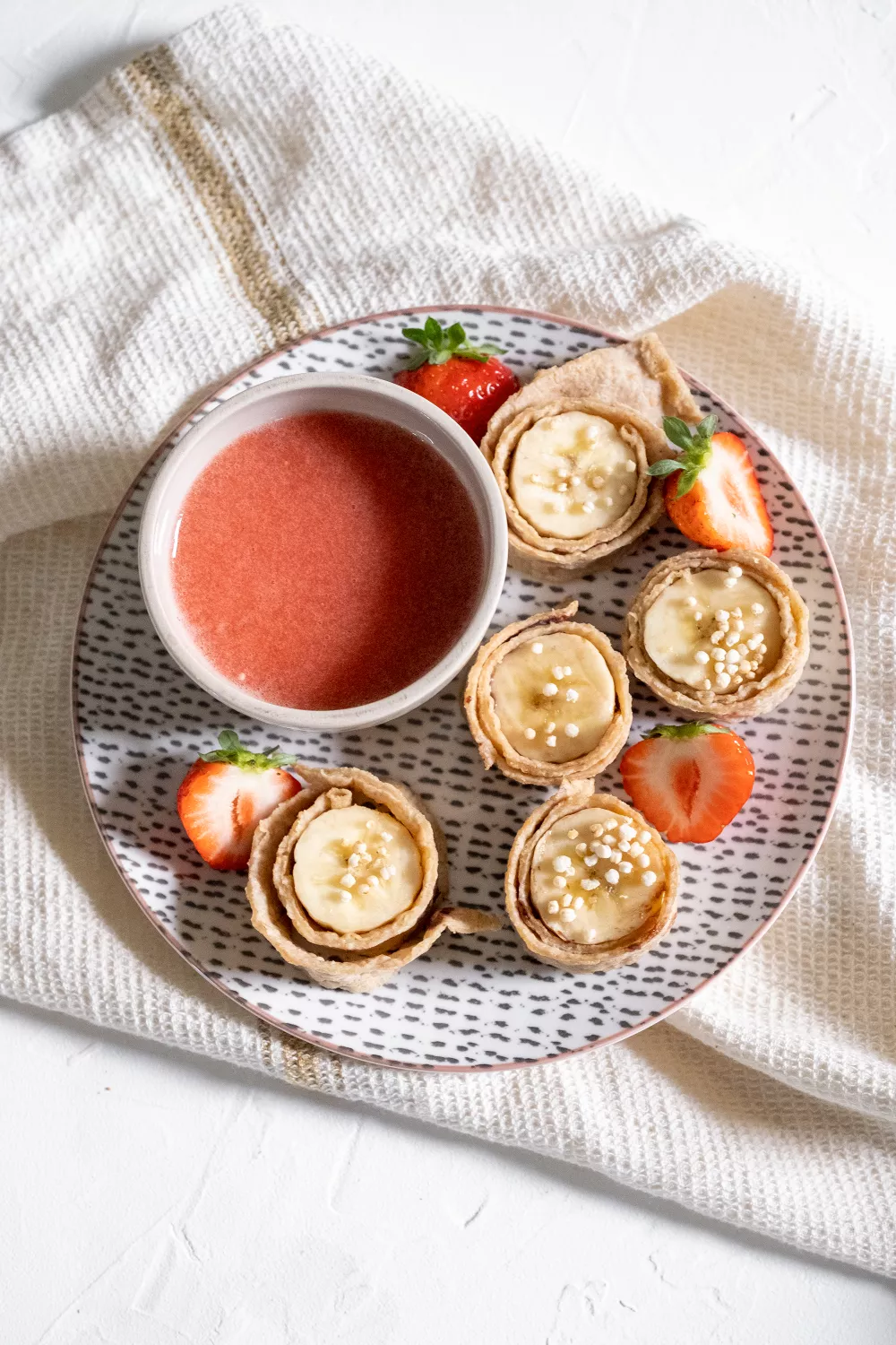 Deze speelse bananensushi combineert luchtige spelt en haverpannenkoeken met zoete banaan, frisse aardbeiensaus en krokante gepofte quinoa. Snel om te bakken, te blenden en op te rollen, ideaal voor brunch, kinderverjaardag of een zomerse picknick. Met esdoornsiroop en chocoladekorreltjes maak je eenvoudig een feestelijke en lichtzoete snack.