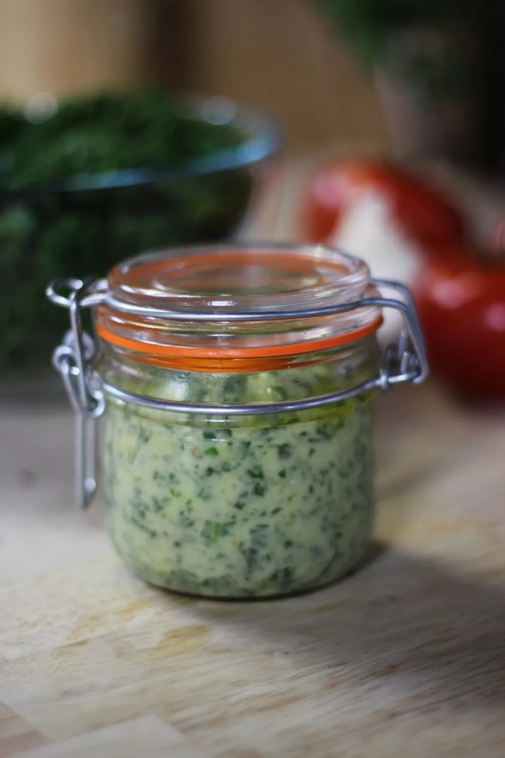 Schep de pesto in glazen potjes. Bestrooi met een snuifje zeezout en giet er een dun laagje olijfolie bovenop om zeker te zijn dat de pesto goed bewaard.