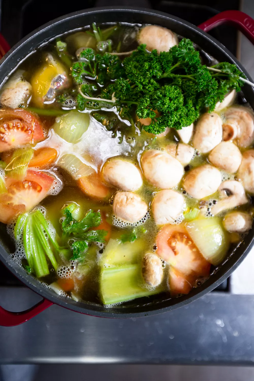 Deze geurige groentebouillon is een lichte en hartverwarmende basis voor soepen, risotto's en sauzen, met wortel, ui, prei, selder, tomaat en champignons als smaakmakers. Door de groenten zacht te stoven, een kruidentuil te binden en aromaten zoals citroenzeste, kaffir limoenblaadjes en piment in een theezakje te infuseren ontstaat een heldere, complex gekruide bouillon. Ideaal voor eenvoudige weekgerechten en seizoenskeuken in alle maanden van het jaar.