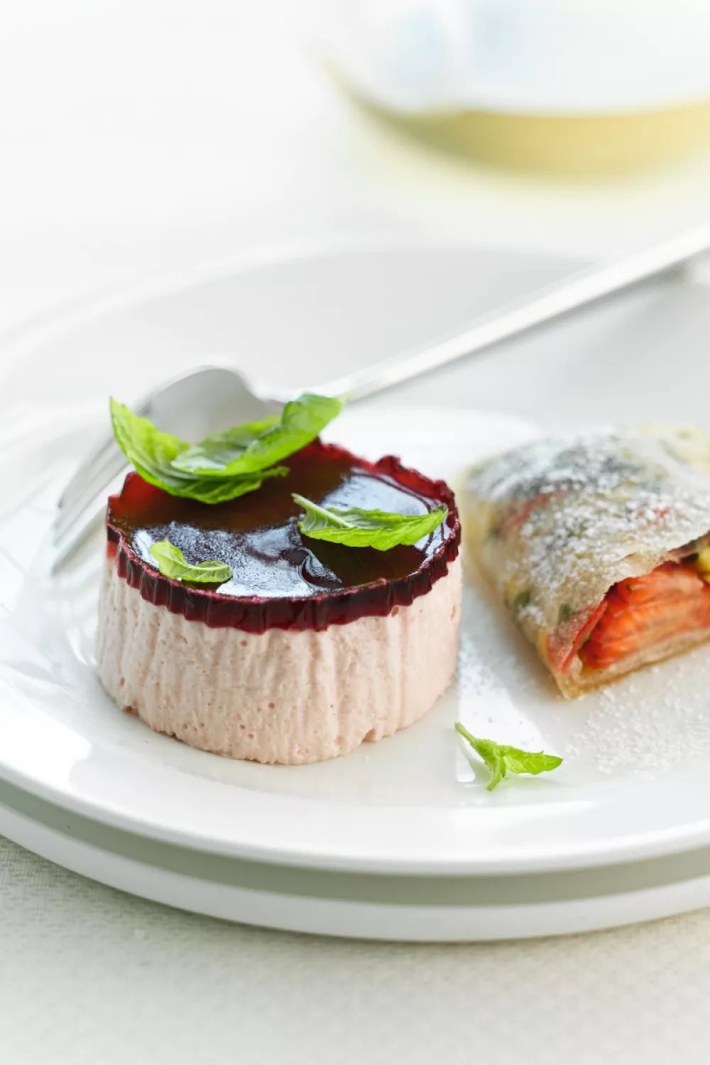 Een luchtige aardbeienbavarois van room en bosaardbeienlikeur krijgt een glanzend laagje van appelkersengelei voor een frisse, fruitige tegenhanger. Krokante wontonloempia's gevuld met honing‑aardbei, pistachenoten en munt zorgen voor textuur en een feestelijke crunch. Ideaal als zomers of lente dessert bij een etentje of bijzondere gelegenheid.