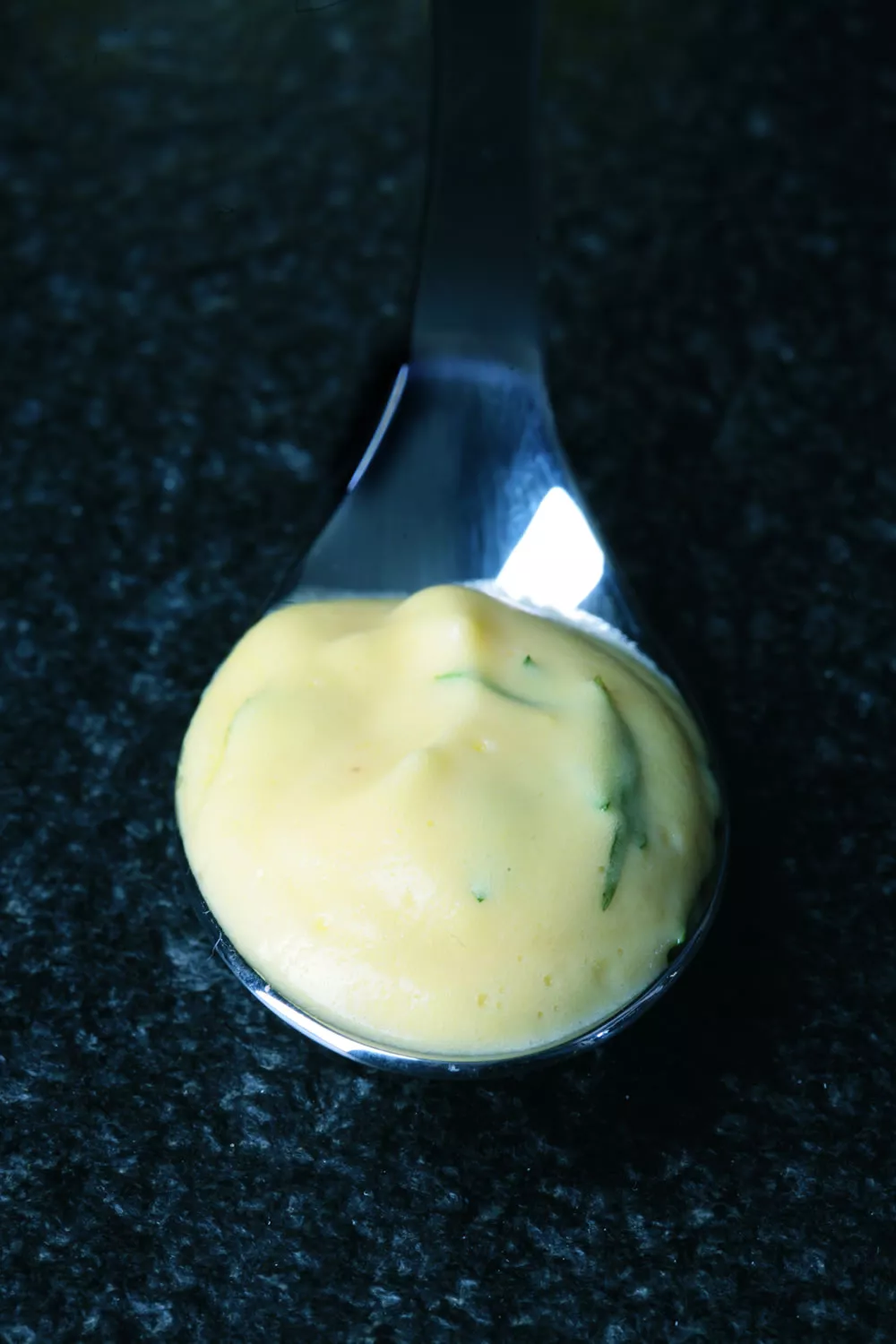 Giet straalsgewijs en onder voortdurend roeren de geklaarde boter op de geklopte eieren.