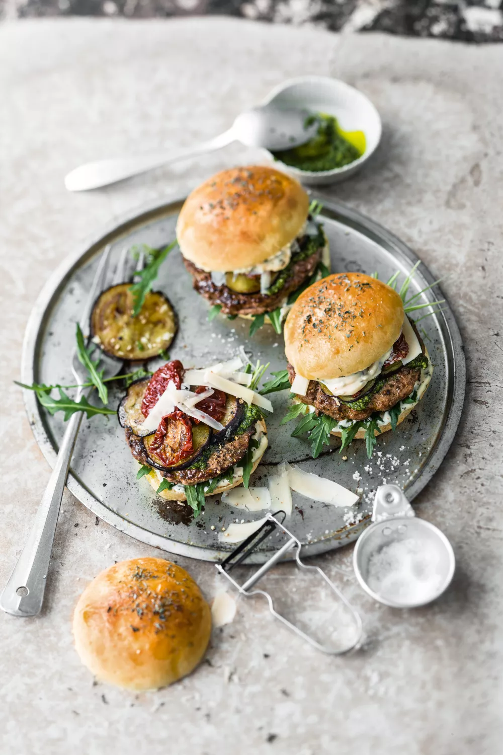 Sappige varkensnekburgers op zachte, briocheachtige broodjes met romige knoflookmayonaise en een frisse basilicumpesto van pijnboompitten en pecorino. De broodjes bak je zelf in de oven, het gemalen varkensvleesmengsel krijgt karakter van tijm en rozemarijn en gegrilde aubergine en zongedroogde tomaten geven mediterrane diepgang. Perfect voor een zomerse barbecue of een gezellige weekendmaaltijd met Italiaanse smaken.