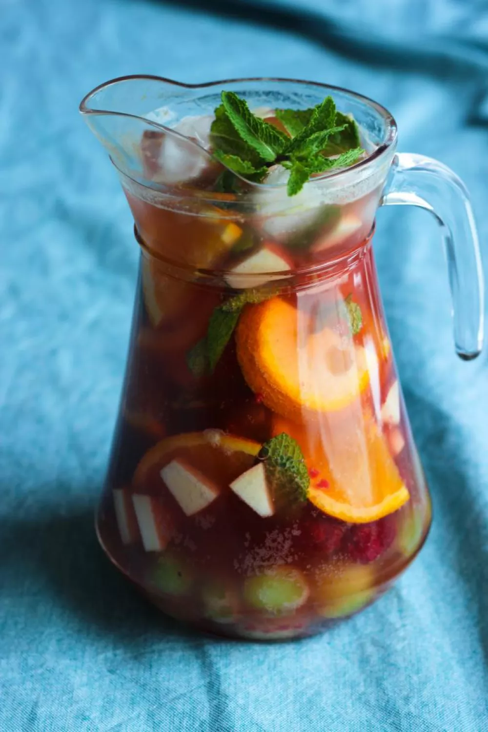 Een luchtige biersangria boordevol fruitige smaken en bruisend frambozenbier, perfect voor een zomerse borrel of barbecue. Bolletjes galia meloen met een parisiennelepel, groene druiven, sappige frambozen, appelblokjes en schijfjes appelsien worden samen met munt, witte wijn en het flesje frambozenbier in een grote kan gemengd. Simpel te bereiden en verfrissend om te serveren in hoge glazen op het terras of als feestelijk aperitief.