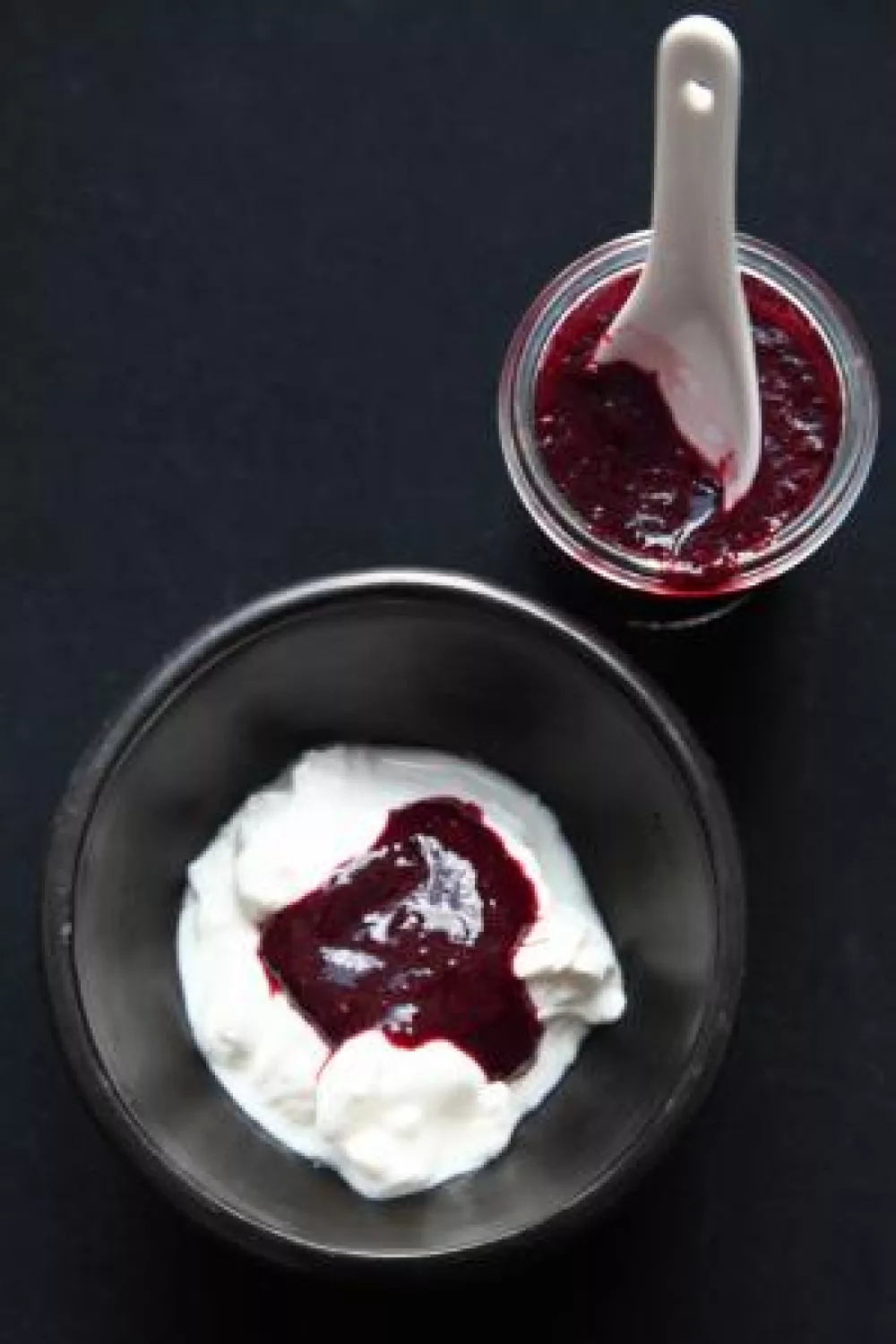 Serveer de bio yoghurt met de coulis in een apart schaaltje.