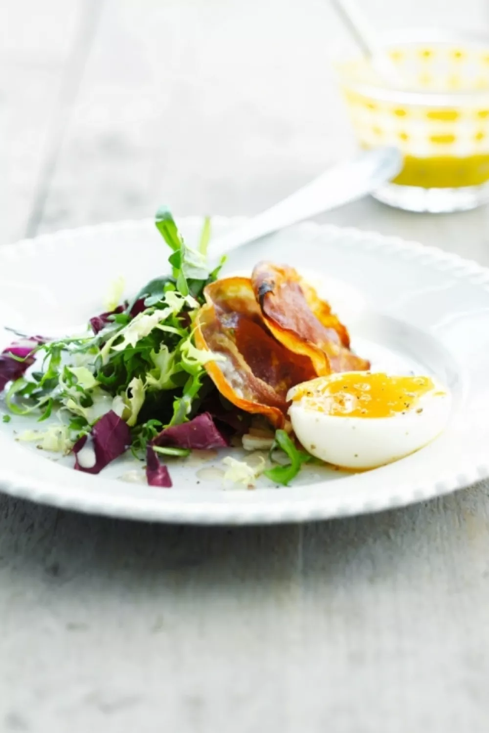 Was ondertussen de sla en verdeel over de kommen. Voeg een zachtgekookt eitje en de pancetta toe.