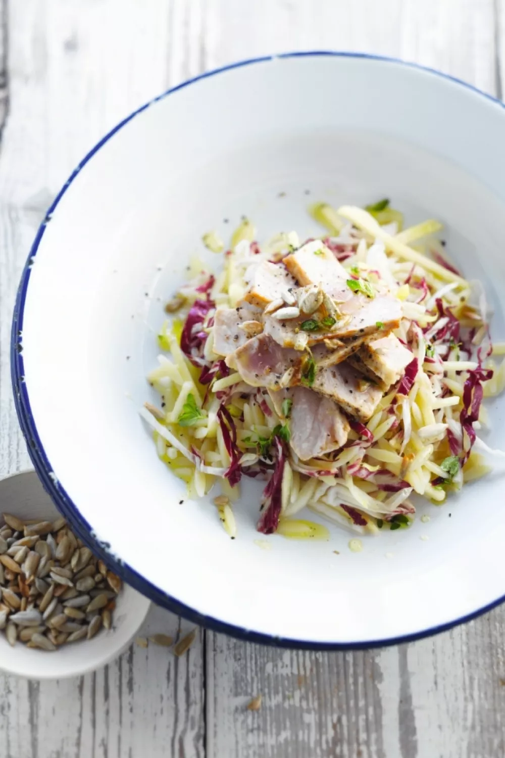 Deze bitterzoete orzo combineert orzo met krokante zonnebloempitten, honing en witte balsamico tot een frisse dressing die perfect speelt met bittere radicchio, knapperig witloof en zoete appel. Sappige varkensmignonettes worden kort gebakken en laten rusten zodat ze mals blijven. Een eenvoudige mediterrane lunch of licht herfstig diner waarbij roosteren en bakken de smaken laten spreken.