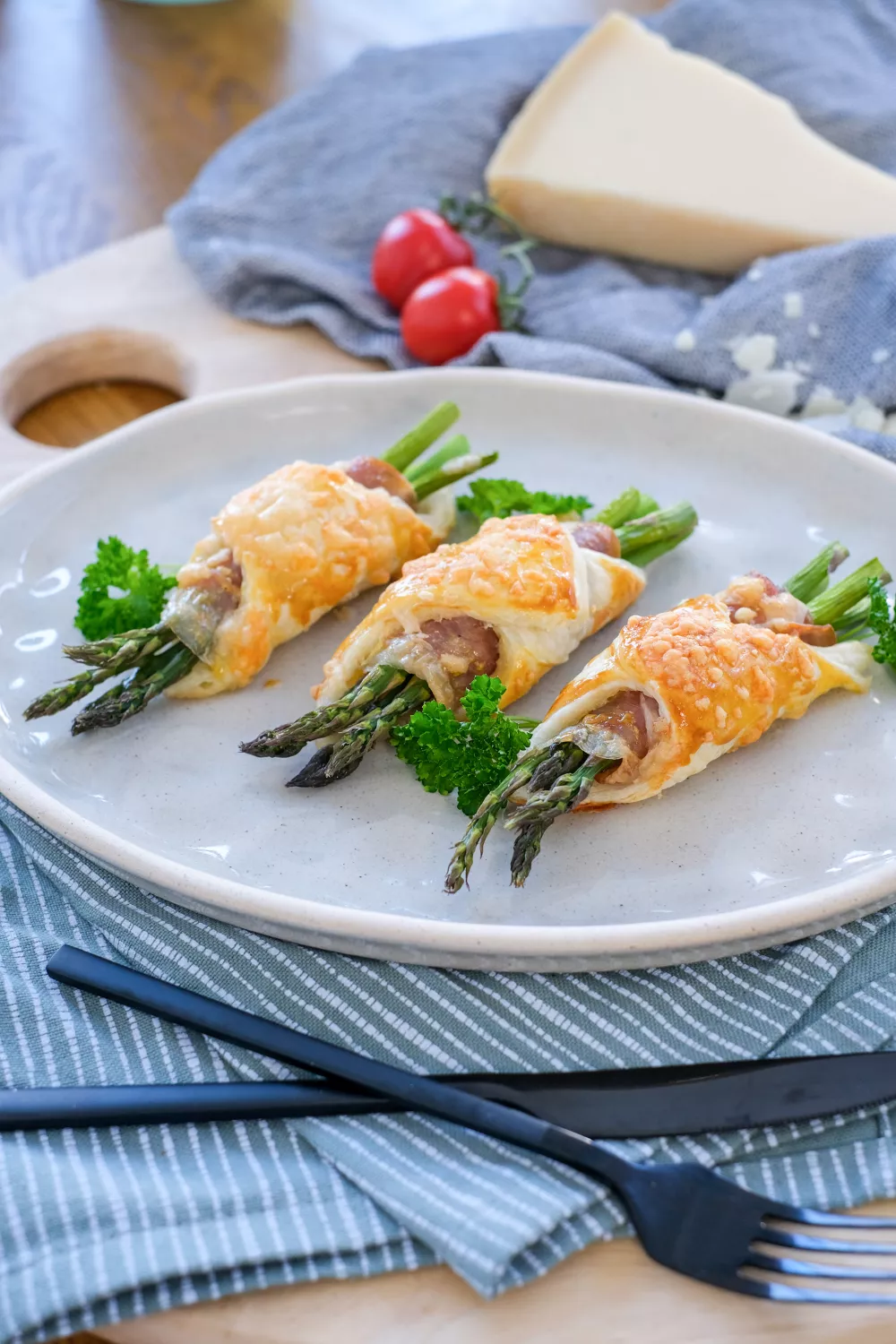 Knapperige bladerdeeghapjes met kleine groene asperges en gerookte ham zijn perfecte borrelhapjes voor de lente en zomerse picknicks. Een hartige toets van Parmezaanse kaas en een gouden glans van eidooier, eenvoudig op te rollen en in de oven te bakken. Makkelijk te maken en ideaal als aperitief, tapas of snelle snack bij een gezellige borrel.
