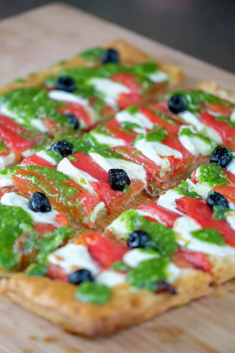 Deze knapperige bladerdeegpizza met smeuïge mozzarella en intens zoete gedroogde tomaatjes is ideaal voor een snelle lunch of gezellige borrel. Krokant bladerdeeg uit de oven, een scheut olijfolie en een frisse rucolapesto met pijnboompitten en Parmezaanse kaas geven een zonnige Mediterrane smaak. De pesto maak je razendsnel in de blender, perfect voor zomerse diners, een lichte avondmaaltijd of weekendbrunch.