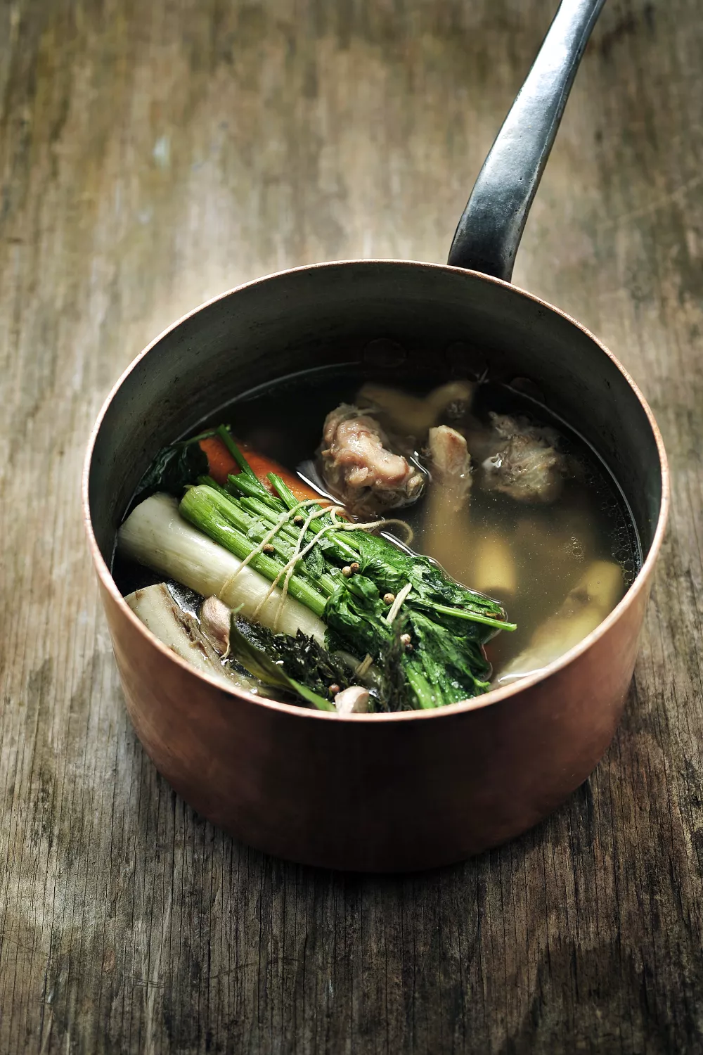Zet de lamsbeenderen op in water. Zorg dat ze onderstaan, en breng aan de kook. Schuim regelmatig af met een eetlepel, en ontvet.