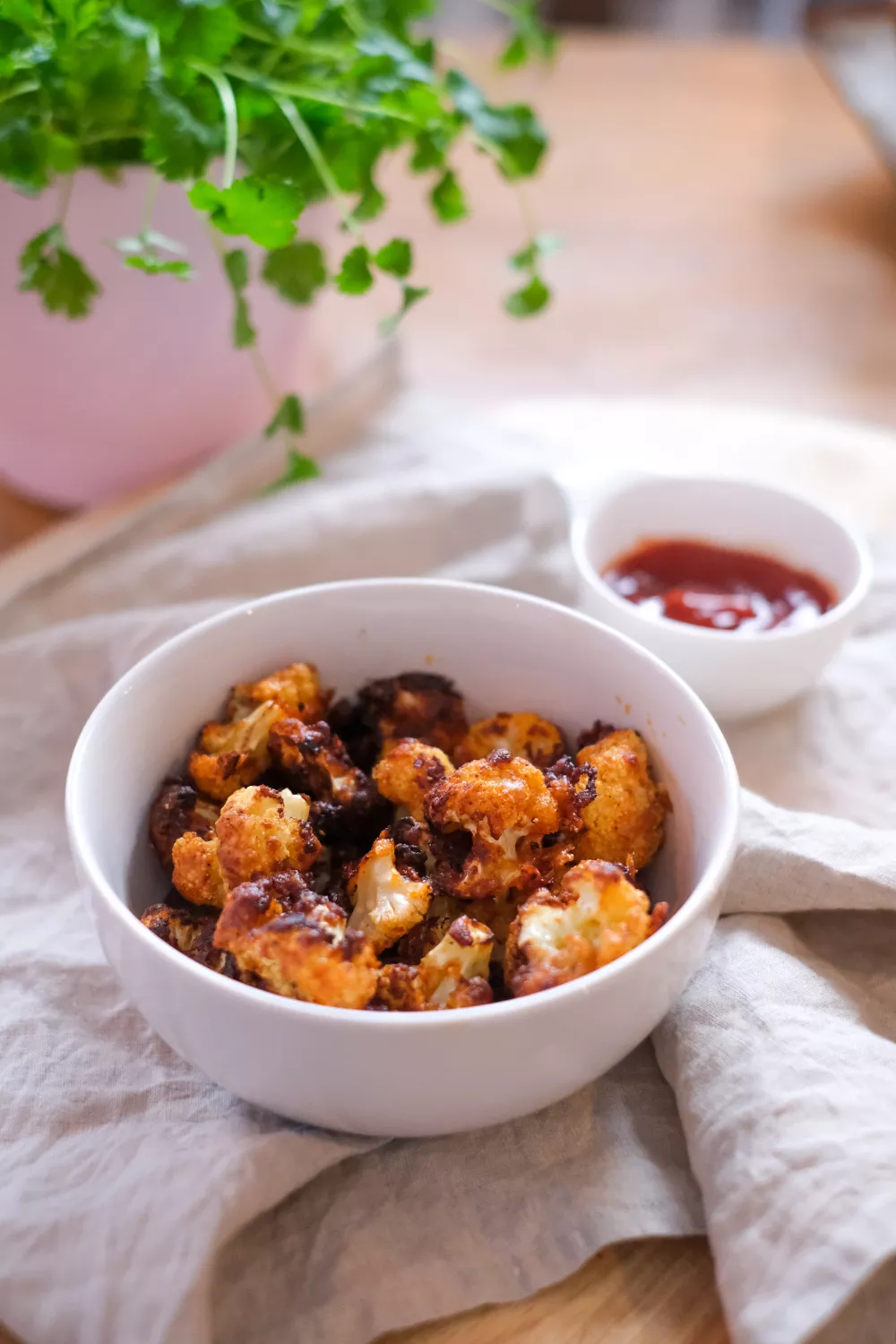 Knapperige bloemkoolbites met gesmolten boter en een hartige korst van Parmezaanse kaas en paprikapoeder, ideaal als vegetarische borrelsnack of warm bijgerecht in de herfst. In de oven worden de roosjes goudbruin en licht pittig, een eenvoudige bereiding die weinig tijd vraagt. Serveer met een frisse dipsaus voor een smaakvol en snel hapje.