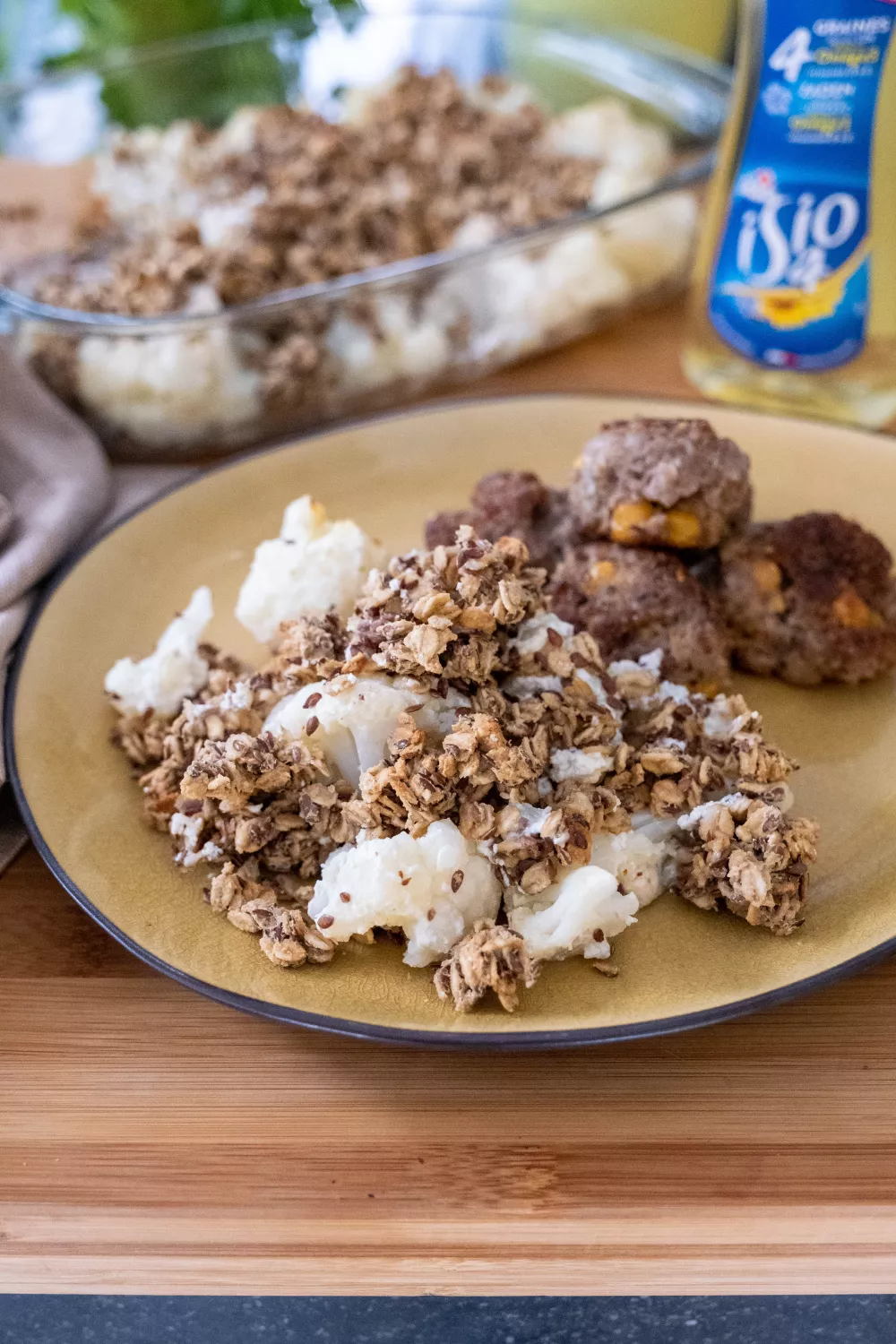 Een smeuïge bloemkoolcrumble met een krokante korst van havermout, lijnzaad en tahini wordt ovengebakken en gecombineerd met sappige albondigas van lamsgehakt en kikkererwten. Romige ricotta met mosterd zorgt voor frisse zachtheid terwijl kort blancheren en goudbruin bakken voor fijne textuur zorgen. Ideaal als hartige herfst of wintermaaltijd met mediterrane accenten om samen te delen.