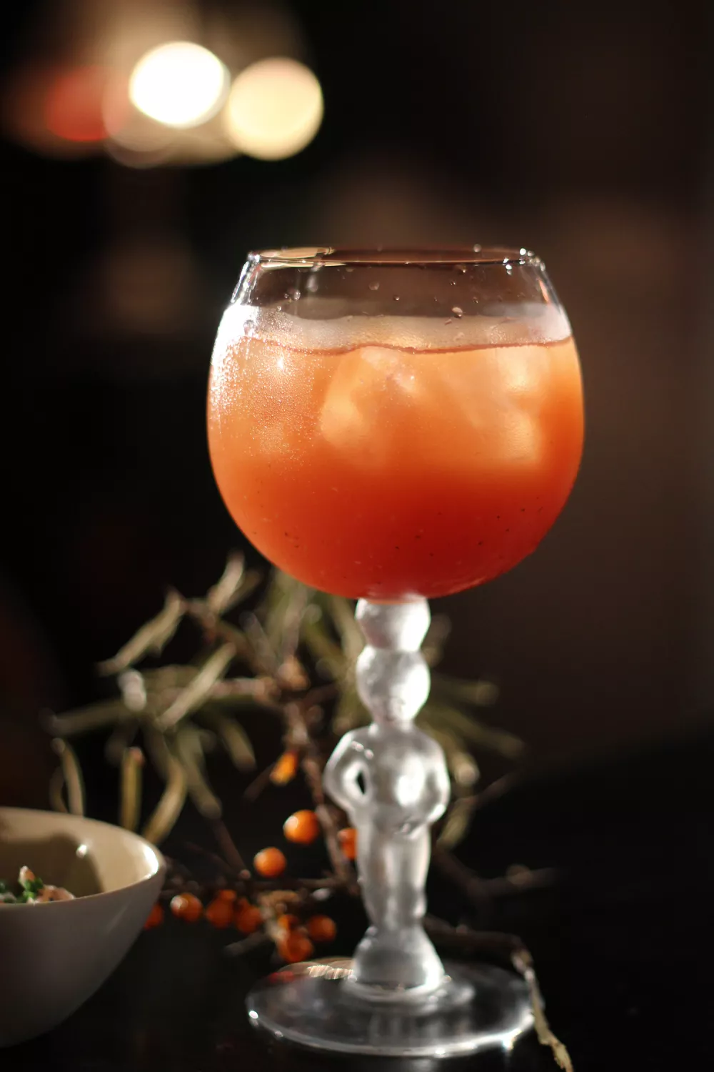 Ververs het ijs in het glas en giet de cocktail er vervolgens in. Werk het glas af met een takje duindoornbes.