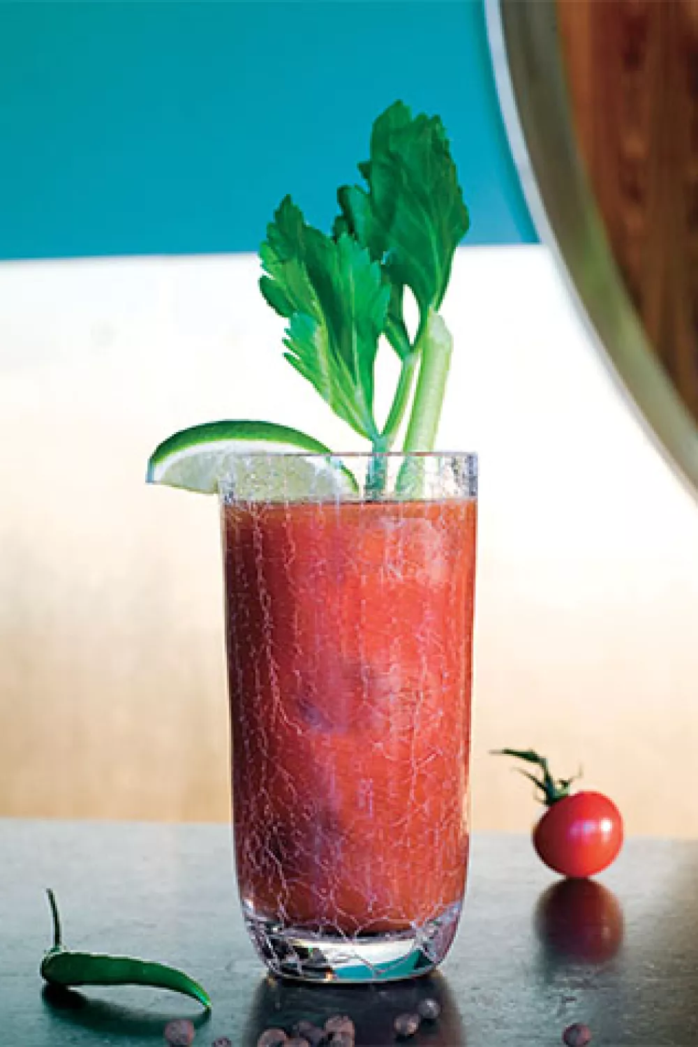 Garneer met een selderstengel en een partje limoen.