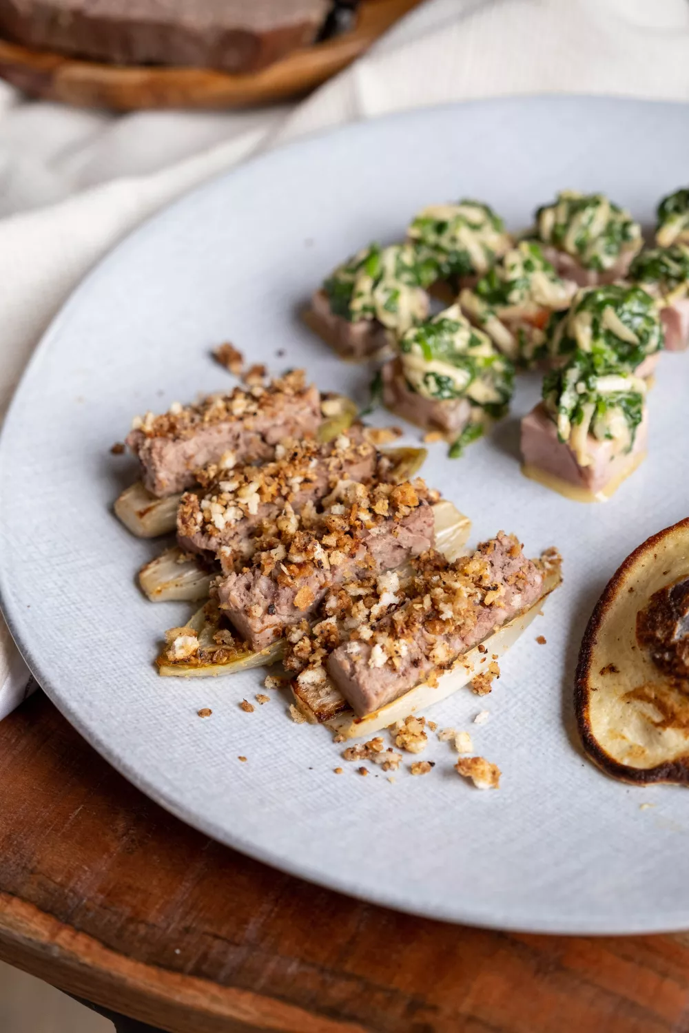 Romige boerenpaté krijgt extra diepte naast zacht gestoofd witloof en een knapperig broodkruim met hazelnoten en Oude Flandrien kaas. Het witloof wordt kort aangezet in boter en in de oven nagegaard terwijl broodkruim en noten goudbruin worden gebakken, voor een fijne mix van textuur en hartige smaken. Perfect als herfstig borrelhapje of snelle lunch met lokale ingrediënten.