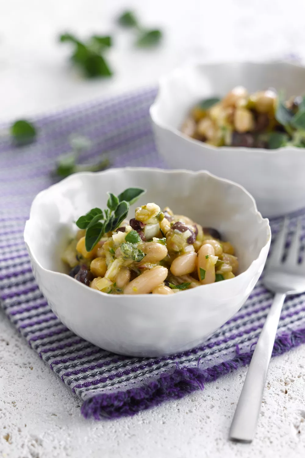 Deze kleurrijke bonensalade combineert witte bonen, sojabonen, adzukibonen en kikkererwten met fijne sjalot en een pittige vinaigrette met mosterd voor een frisse, hartige smaak. De bonen worden eerst geweekd en apart gaar gekookt waarna ze met olijfolie, rode wijnazijn en verse oregano en bonenkruid worden gemengd. Perfect als lichte lunch, zomers bijgerecht of stevige salade voor op de picknick.
