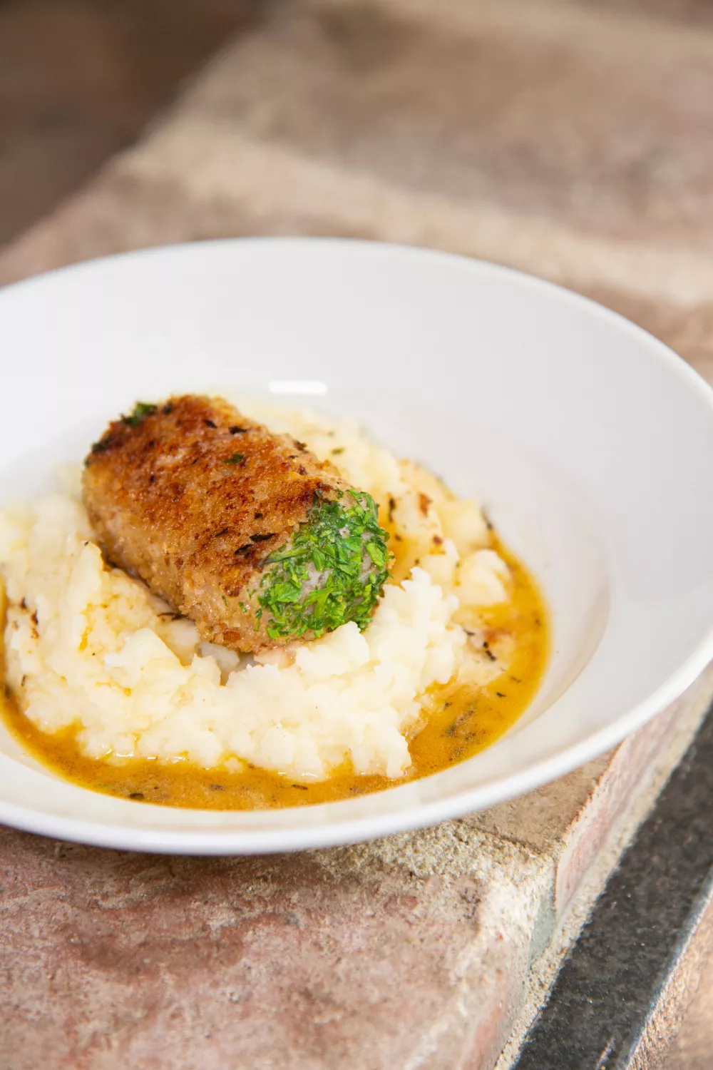 Serveer met de puree. Maak een kuiltje in de puree en vul het kuiltje met de boter uit de pan.