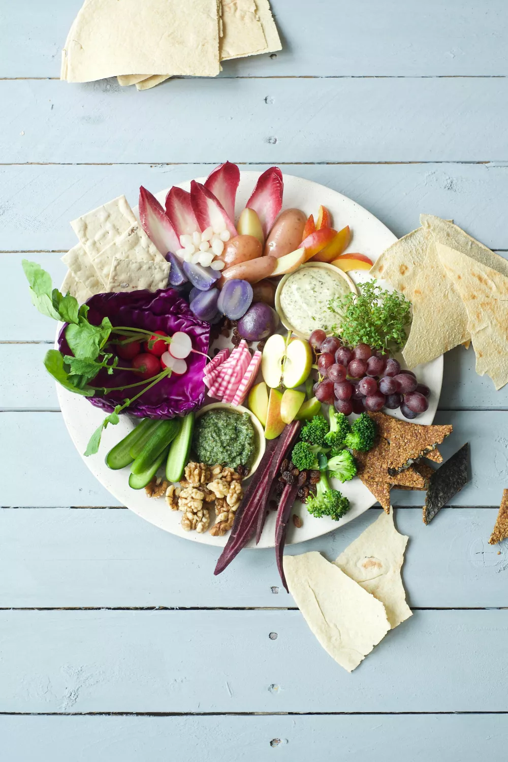 Op de foto zie je nog roodlof, zilveruitjes, gekookte rosevalaardappels, gekookte truffelaardappels, pruimen, tuinkers, Italiaanse crackers, druiven, broccoli, walnoten, appel, snackkomkommertjes, chioggiabiet, radijs en rode spitskool.