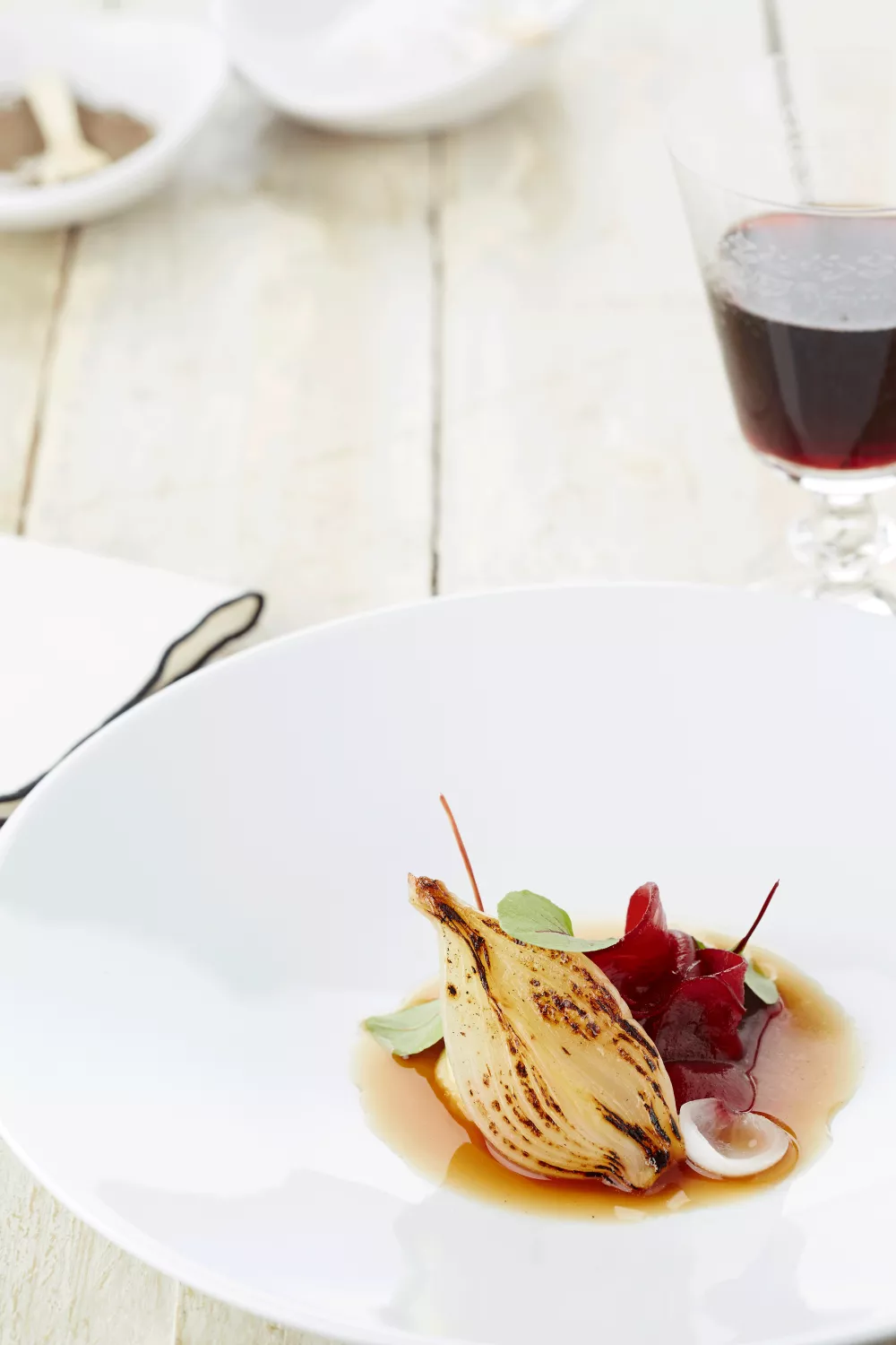 Een heldere bouillon met zoete rode biet en gekarameliseerde ui brengt rustieke smaken en frisse elegantie samen. Geroosterde biet in zoutkorst wordt in een vinaigrette van rode wijnazijn en olijfolie gemarineerd, terwijl uien langzaam kleuren en bevochtigd worden met gevogeltebouillon die daarna wordt ingekookt en gezeefd. Serveer als warm voorgerecht of lichte lunch, afgewerkt met bloedzuring en knapperige zoetzure uitjes.