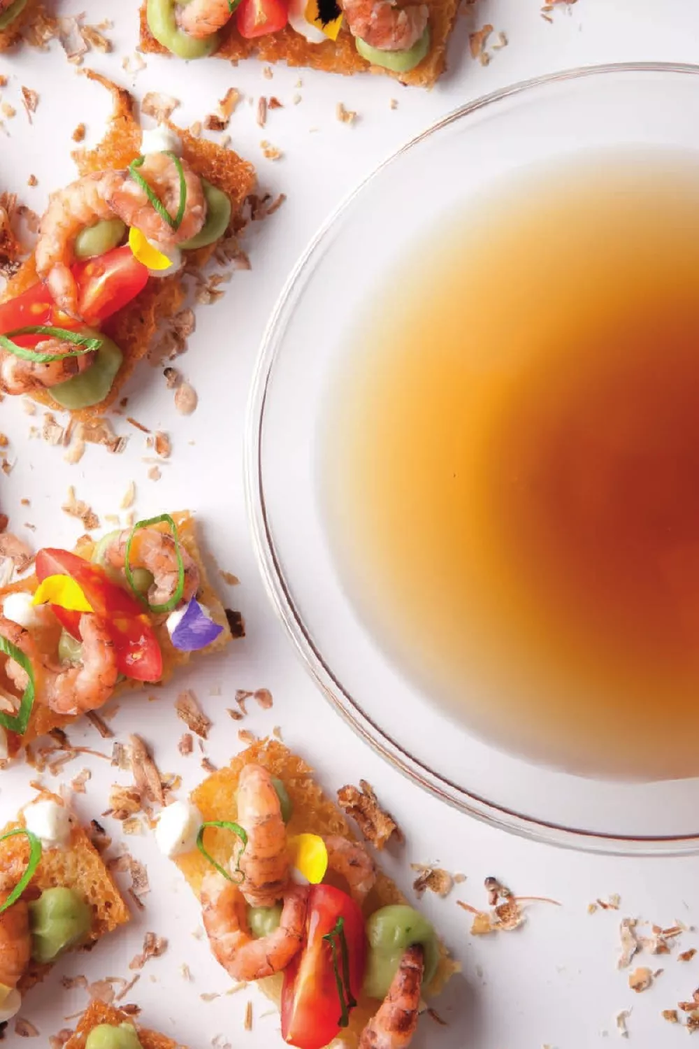 Deze intens aromatische garnalenbouillon vangt de zilte umami van garnaalkoppen en wordt verfrist door tomaat en limoen, met romige avocado en plattekaas voor zachte tegenhangers. De bereiding werkt met een geconcentreerde getrokken bouillon, huisgemaakte garnalenboter en krokante roggebroodtoast voor textuur, waarbij gedroogde koppen in de oven of droogtrommel extra diepte geven. Ideaal als verfijnd voorgerecht voor een feestelijk diner of een lichte lente of zomerlunch.