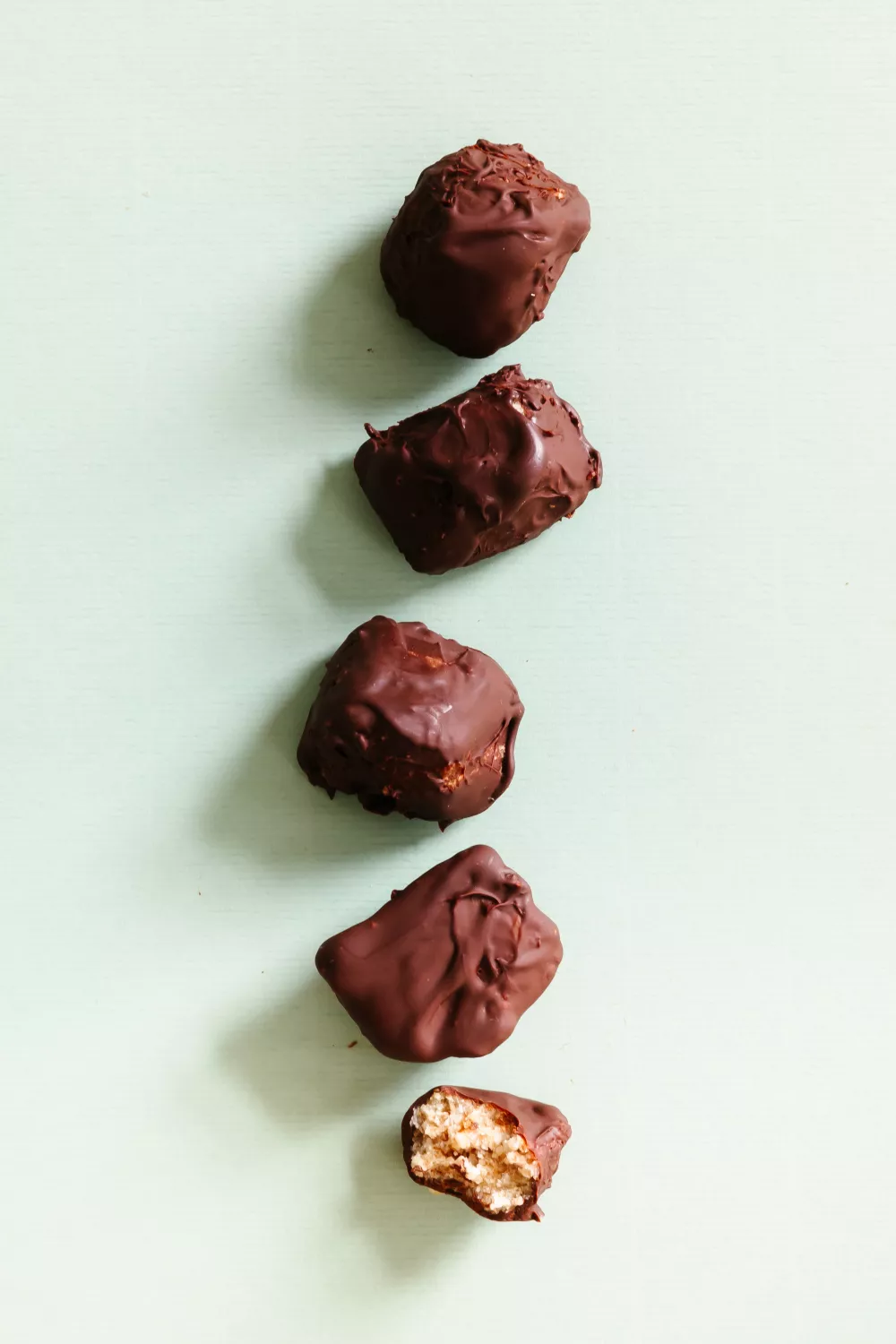 Meng alle ingrediënten, behalve de chocolade, in de keukenrobot tot een samenhangende massa. Rol het mengsel in de gewenste vorm (balletjes, reepjes of vierkantjes). Leg op een bord met bakvel en zet 10 minuten in de diepvriezer of 20 minuten in de koelkast. Smelt de chocolade au bain-marie. Rol de vormpjes erdoor en leg ze terug op het bakvel.