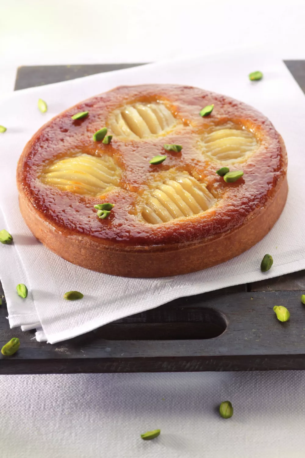 Verwarm de oven voor op 160 °C. Meng alle ingrediënten, behalve de room en de peertjes, in de keukenmachine. Spatel er daarna de vloeibare room door. Snijd de peertjes in 2 en elke helft in smalle repen. Leg de repen peer op de bodem van de taart. Doe de crème in een spuitzak en spuit deze tussen de peren. Bak de taart 20 tot 25 minuten in de warme oven.