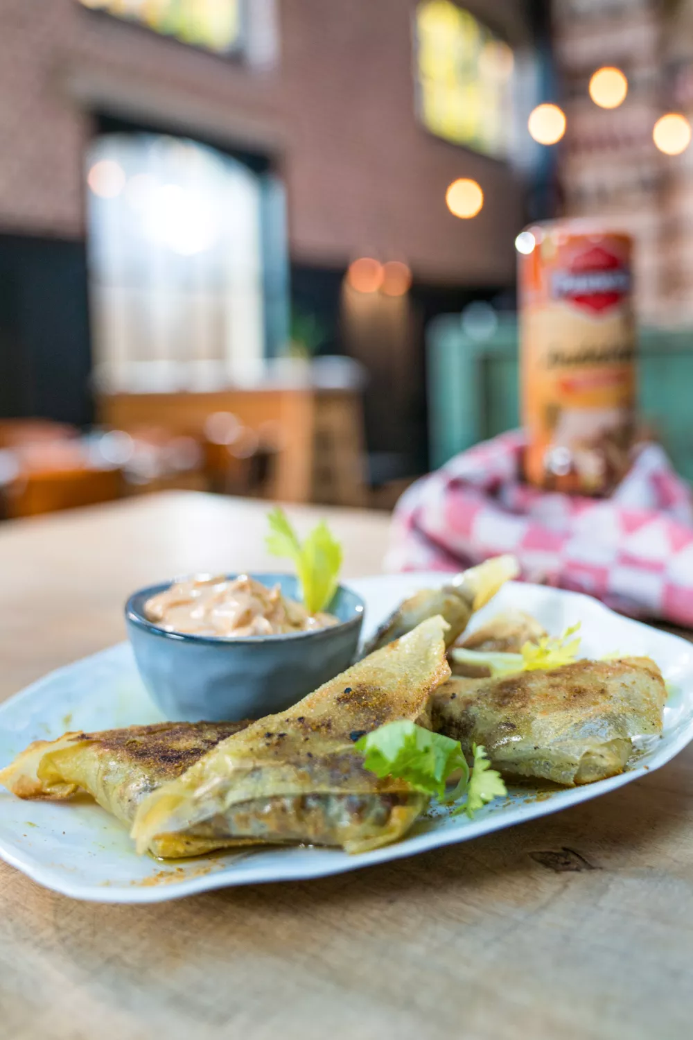 Doe de yoghurt-andalouse saus in een potje en serveer samen met de brickdeeghapjes.