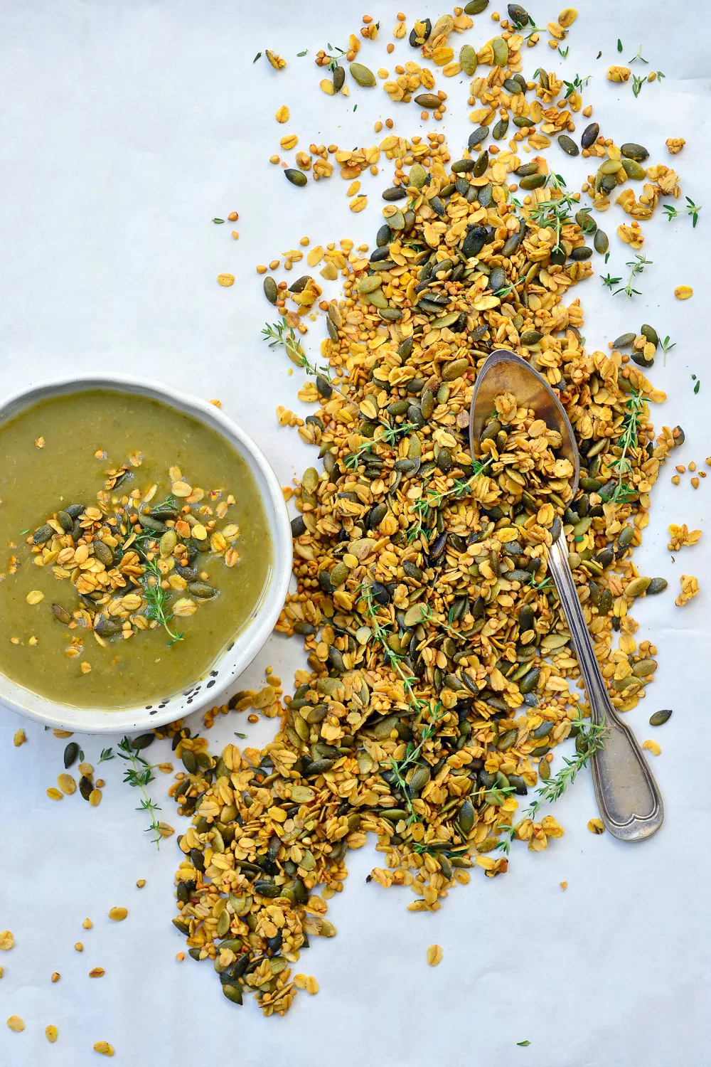 Verdeel de soep over verschillende kommetjes. Werk af met de hartige granola.