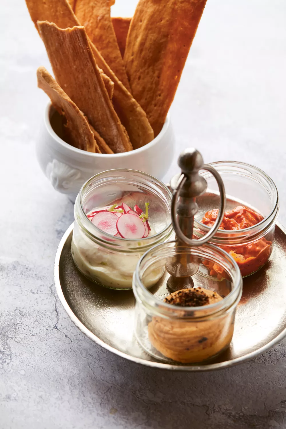 Deze knapperige broodchips van semola-deeg met drie smaakvolle dips zijn ideaal voor een borrel, zomerse picknick of gezellig aperitief. Het deeg wordt kort gekneed, een nacht gekoeld en ultradun uitgerold met de pastamachine voordat het in de oven krokant bakt. Serveer met een frisse lente-ui en radijs volle versekaas, een pittige linzenharissa dip en geroosterde paprikacoulis met geitenkaas en dille.
