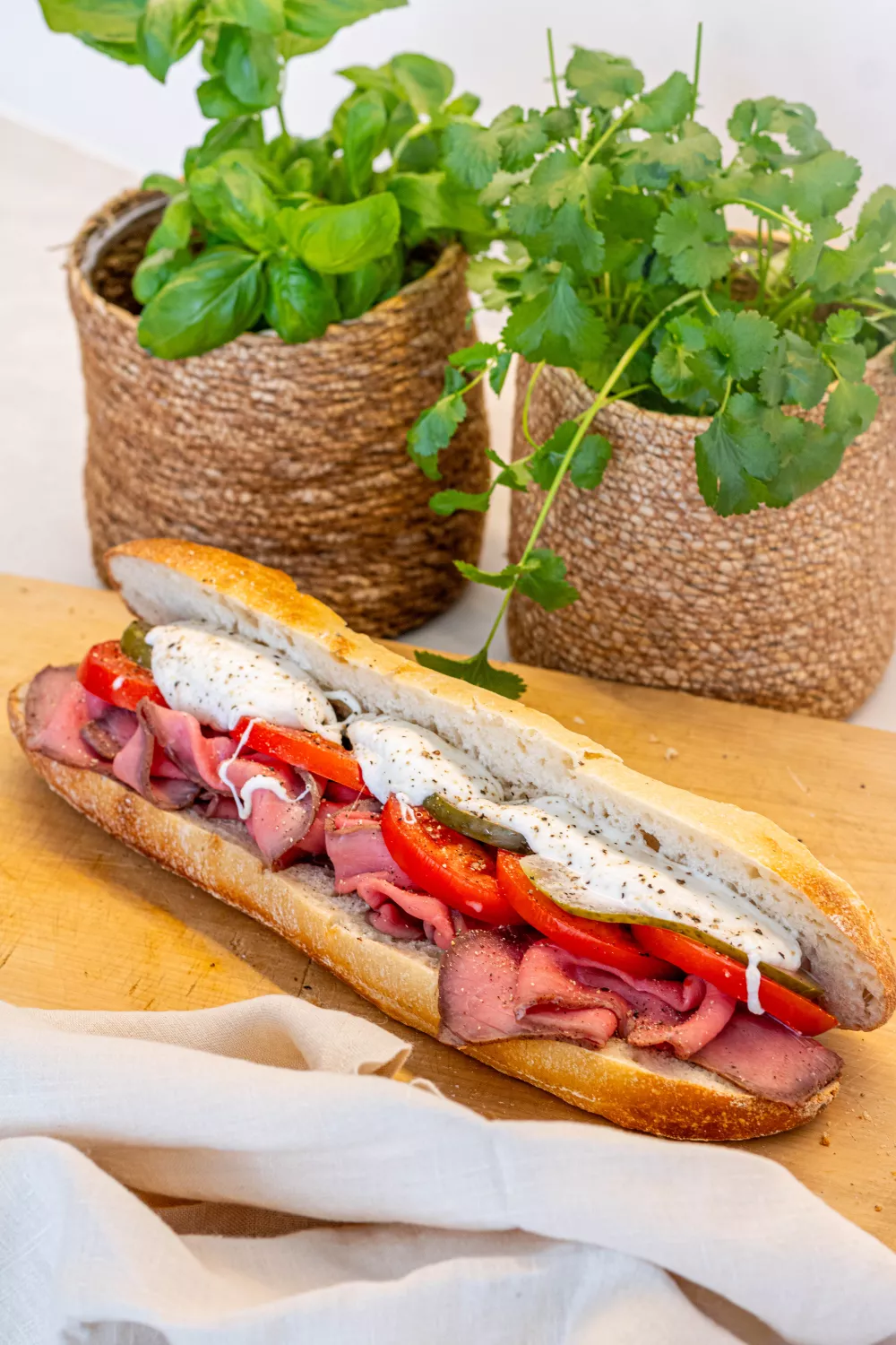 Snijd het stokbrood open en beleg met rosbief, tomaat en augurk.