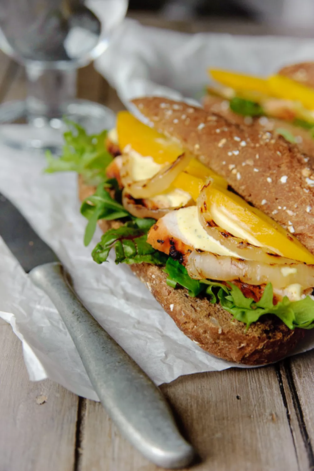 Dit frisse broodje kip met mango combineert sappige gegrilde kip en zoete mangopuree met een romige kerriesaus, op smaak gebracht met limoen en een tikje tabasco. Ideaal als zomerse lunch of licht diner, met knapperige bruine broodjes, gemengde sla en goudbruin gebakken uien voor extra textuur. Snel en simpel klaar te maken, perfect voor picknick, barbecue of een makkelijke doordeweekse maaltijd.