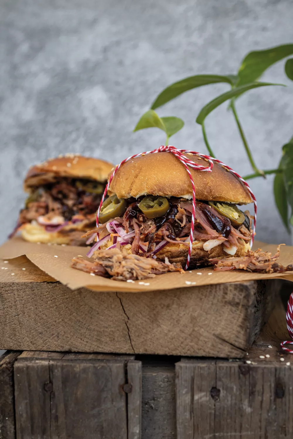 Sappige pulled pork van Iberico procureur met een gekruide korst, zachte briochebollen, pittige jalapeño ringen en frisse zelfgemaakte coleslaw zorgt voor een perfecte balans tussen rook, zoet en zuur. Het vlees wordt langzaam gegaard en gerookt op de barbecue, afgelakt met bier en BBQ saus voor diepe, complexe smaken. Ideaal voor zomerse tuinfeesten, weekendbarbecues of een gezellige winteravond wanneer je iets troostends en royaals wilt serveren.