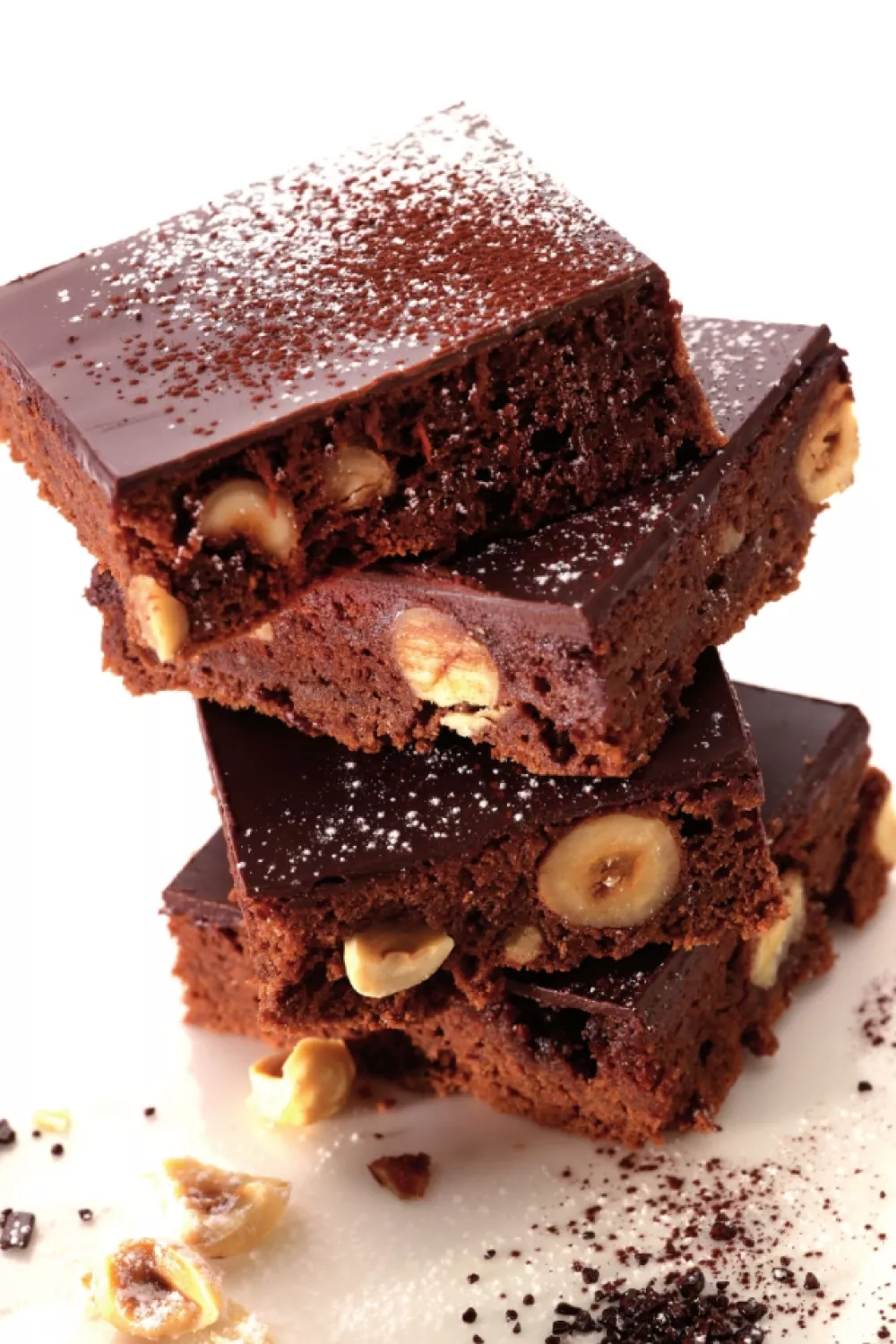 Deze fudgy brownies met fondant en karamelchocolade en krokante hazelnoten combineren een rijke, smeuïge binnenkant met een licht krokant korstje. Door roomboter en gesmolten chocolade te mengen met opgeklopte eidooiers en luchtige eiwitten die voorzichtig gevouwen worden, ontstaat een luchtig doch compact beslag met donkere cassonadesuiker en bloem. Perfect als feestelijk dessert of warme herfst snack bij koffie, klaar in één korte baktijd.