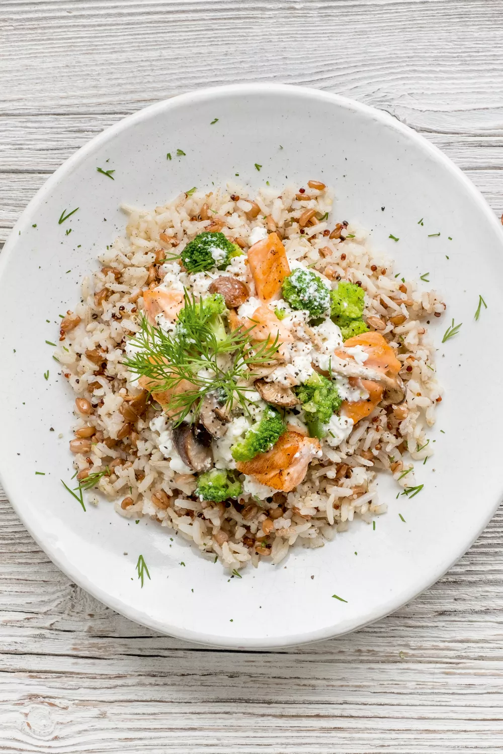 Bruine rijst, spelt en quinoa met zalm, broccoli en champignons