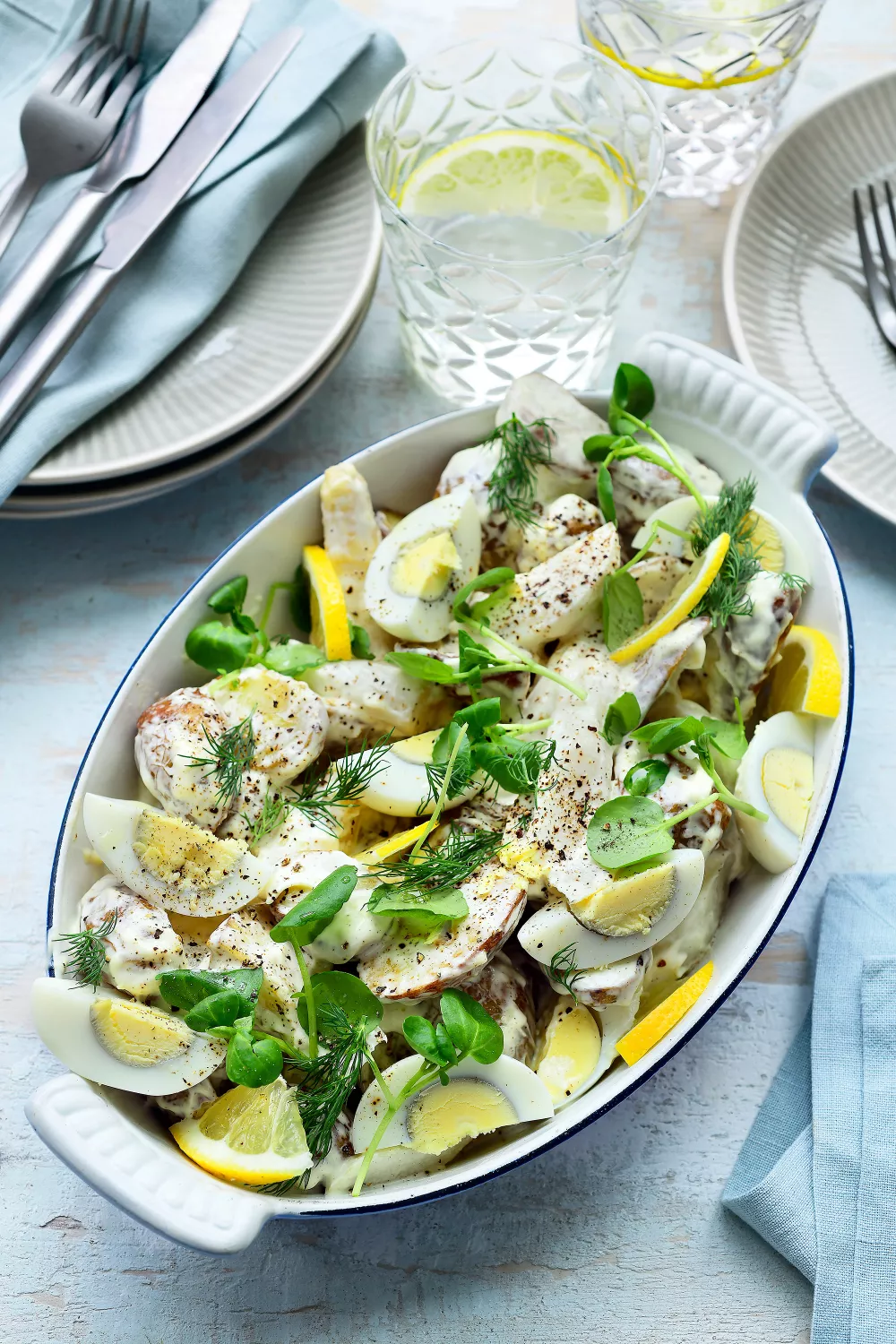 Schep het geheel over in een mooie serveerkom. Pel de eitjes en snijd in partjes, verspreid over de salade samen met takjes waterkers, dille en stukjes citroen.