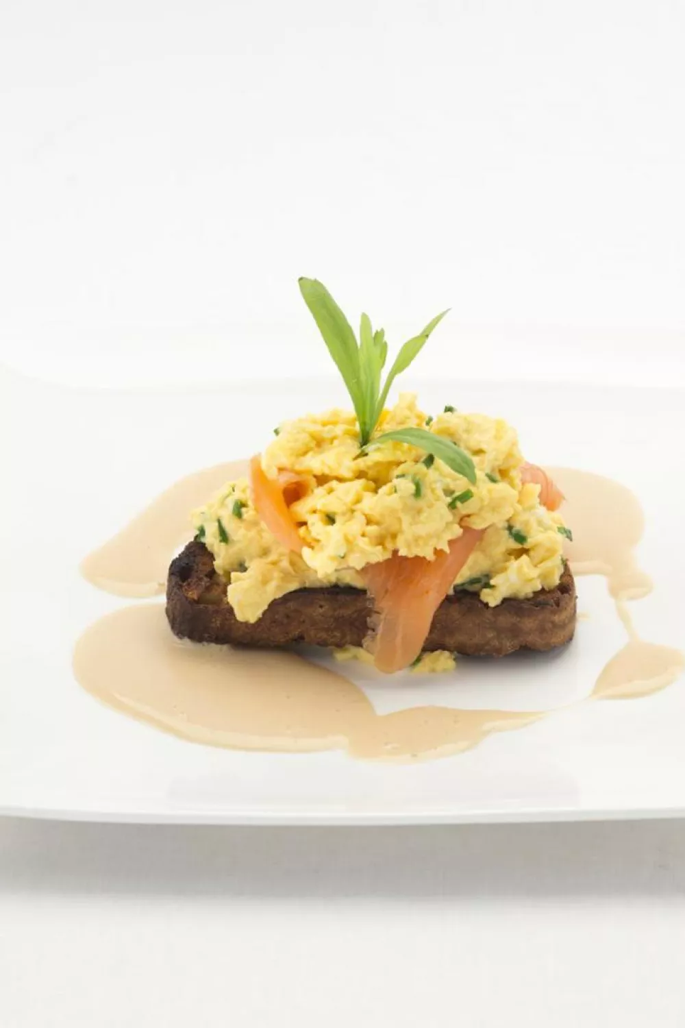 Leg de toast in het midden van het bord en daarop het ei-zalmmengsel. Nappeer er de kreeftensaus rond.
