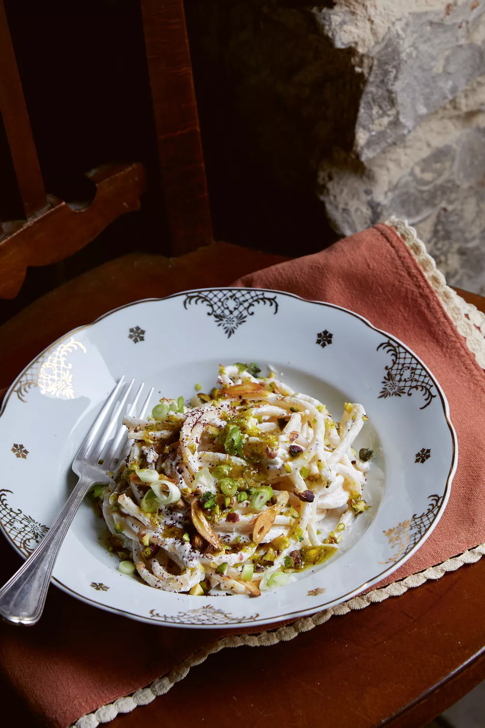 Romige bucatini met Griekse yoghurt, feta en veel knoflook biedt een frisse mediterrane smaak die zowel licht als troostrijk aanvoelt. De saus wordt gladgepureerd en gebonden met eidooiers en een scheut kookvocht, terwijl knapperige pijnboompitten en in olijfolie geroosterde knoflook met Aleppo peper voor textuur en pit zorgen. Perfect voor een snelle doordeweekse maaltijd of een zonnige zomerse borrel, afgewerkt met sumak en fijne lente-ui.
