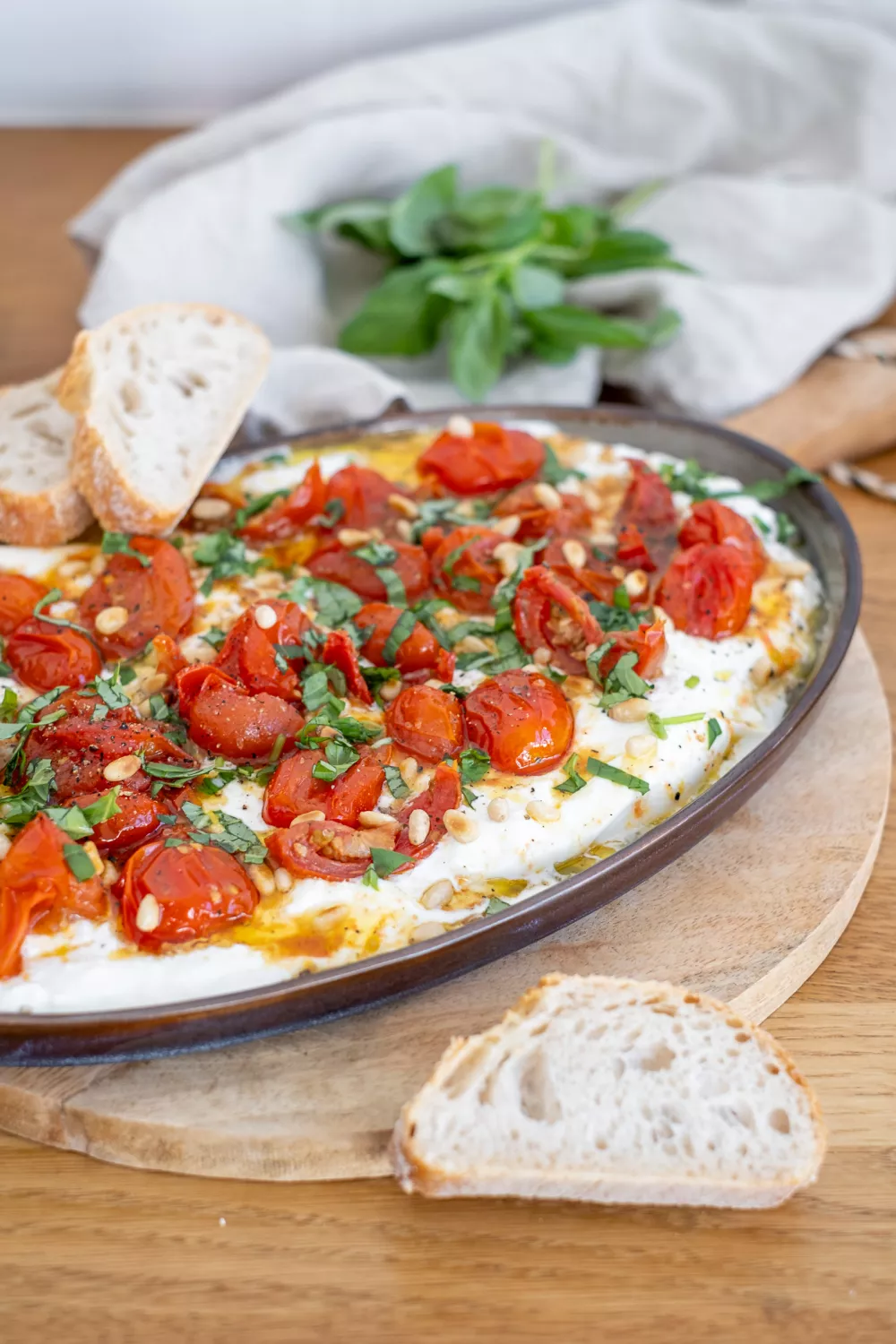 Romige burrata vormt samen met zoete kerstomaatjes en geconcentreerde zongedroogde tomaatjes een onweerstaanbare antipasto vol Italiaanse smaken. De kerstomaatjes kort in de oven roosteren geeft extra diepte, waarna het geheel wordt bestrooid met geroosterde pijnboompitjes en fijngehakte basilicum. Afgewerkt met een drupje truffelolie en geserveerd met krokante ciabatta is dit eenvoudige vegetarische borrelplankje perfect voor zomeravonden, aperitieven of een feestelijk voorgerecht.