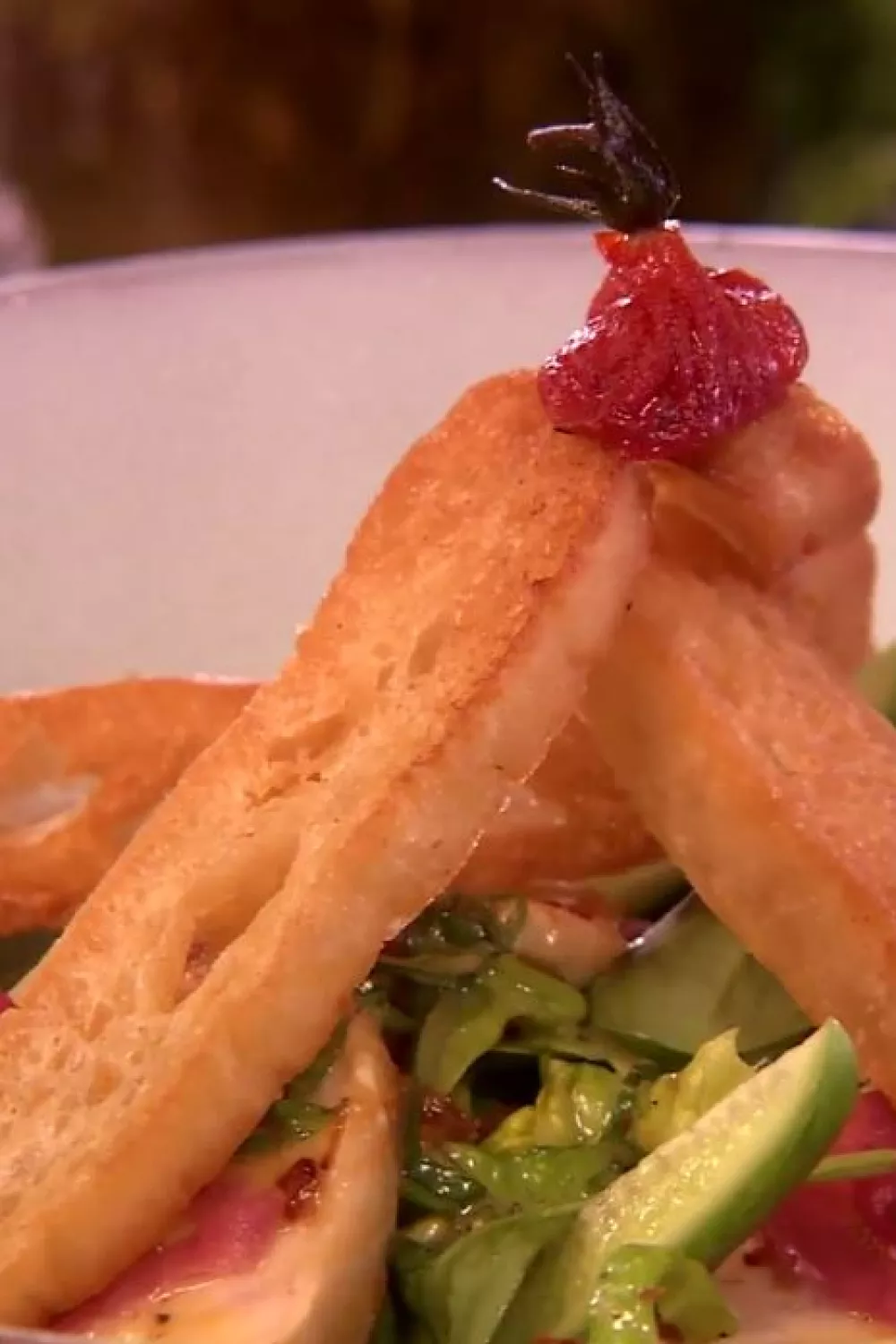 Snij de Mechelse koekoek in fijne reepjes. Dresseer de sla mooi in een bord, schik de kip er bovenop. Werk af met de crumble van spek, de vinaigrette, zoetzure rode ui (snij hiervoor de ui in reepjes en laat opkoken in water met suiker en een scheut dragonazijn), een mini-komkommertje, spinazieblaadjes, de krokante bruschettabroodjes en een gekonfijt tomaatje.