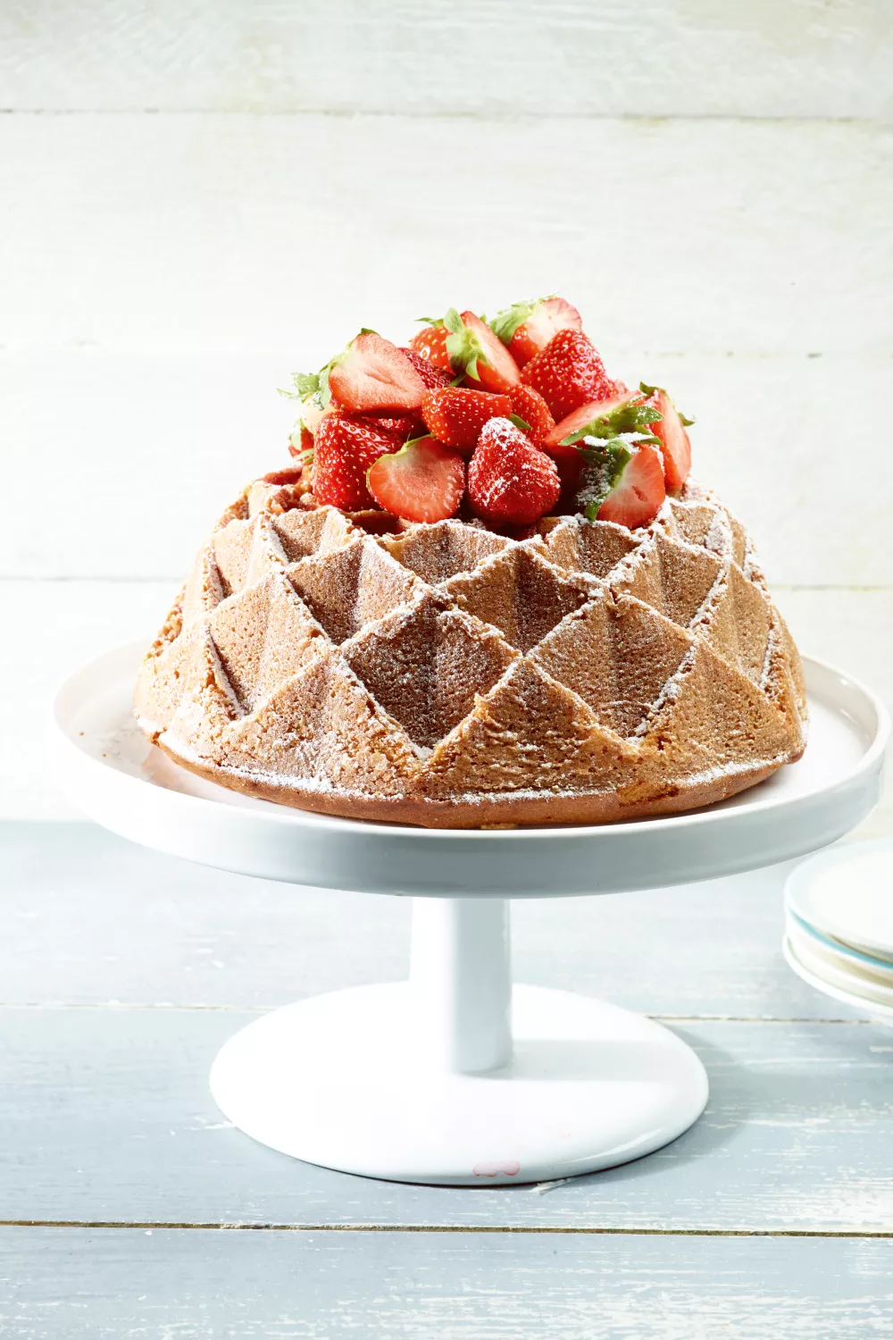 Verwarm de oven voor op 160°C. Bak de cake gedurende 30 tot 40 minuten in de voorverwarmde oven. Haal voorzichtig uit de vorm en laat afkoelen. Garneer met de aardbeienconfituur.