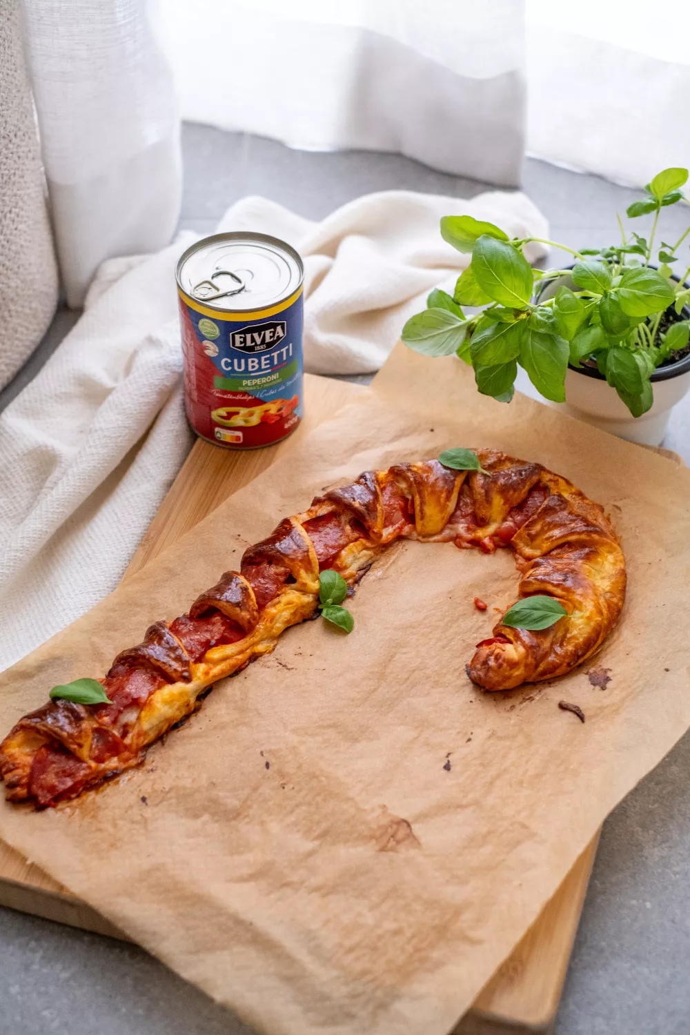 Feestelijk, hartig en krokant: dit candy cane hapje combineert luchtig croissantdeeg met pittige salami, zoete Elvea Cubetti peperoni en gesmolten mozzarella voor een smaakvol borrelhapje. Met een eenvoudige vouwtechniek en een eidooierglans bak je in 15 minuten krokante wandelstokjes die perfect zijn voor aperitief, kerst of winterse borrels. Werk af met verse basilicum voor een frisse toets.
