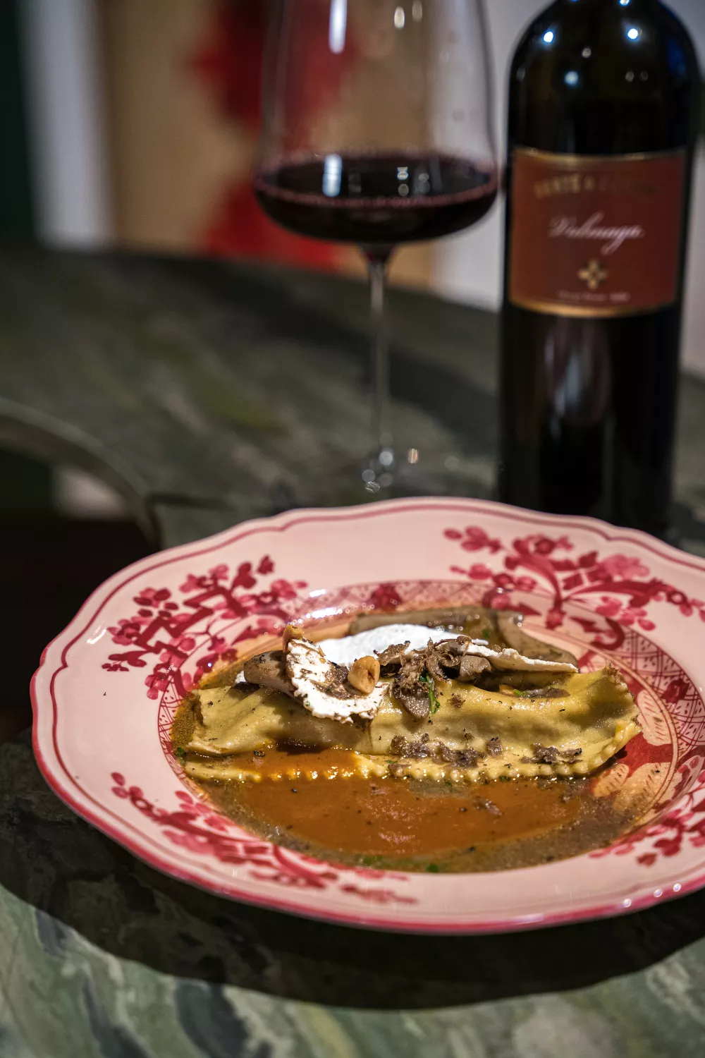 Een gerecht met veel smaak en diepgang. Echt ‘comfort food’ vraagt een glas wijn die evenveel plezier verschaft als het bord met eten. We zitten met de smeuïge structuur van de pasta, ossenstaart en cêpes. De herfstaroma’s van de paddenstoelen, kastanjes en truffel willen we ook terugvinden in de geur van de wijn. Dus daarom kiezen we voor een wijn met enkele jaren op de teller. 2015, absoluut topmillésime in Lombardije. We hebben de druif croatina (vertaald is meisje uit Kroatië, die ook meteen de herkomst aantoont van die druif) en staat gekend voor zijn fraîcheur en dynamiek. Anderzijds hebben we ook de druif barbera, waarvan je weet dat er een pak mooie aroma’s gaan meekomen van rijp zwart fruit en specerijen. Berté & Cordini is een familiaal gerund domein die in Oltrepò Pavese dé referentie is.