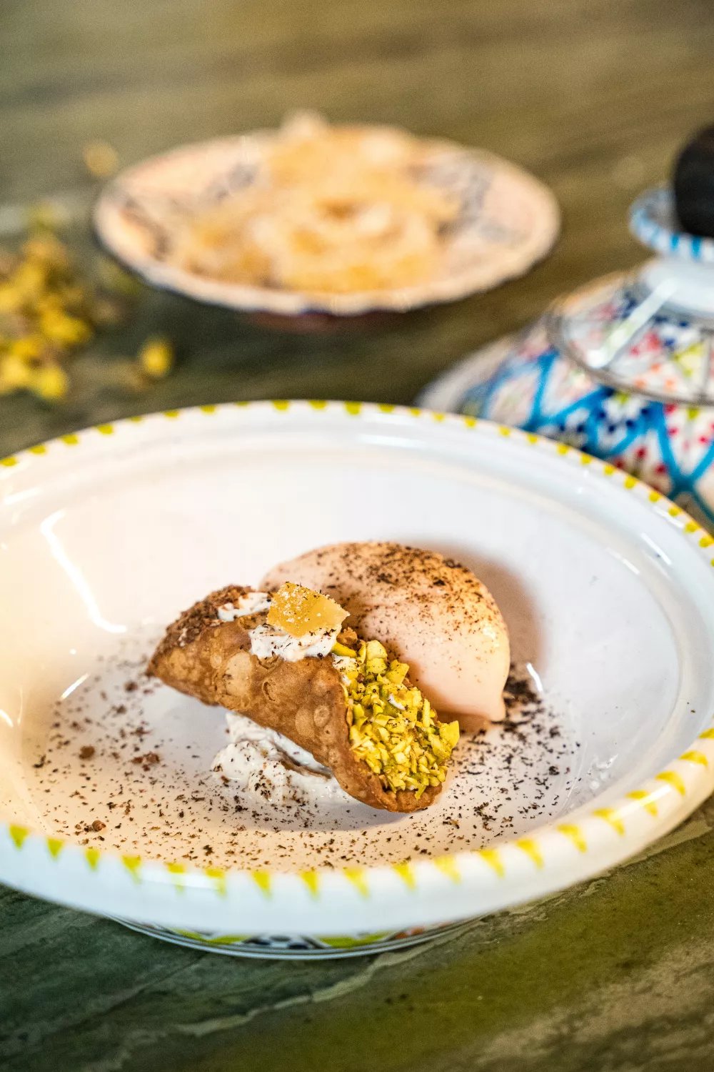 Rooster de pistachenoten in een droge pan op het vuur en hak ze daarna fijn. Doe de vulling van ricotta in een spuitzak en vul elke cannoli op. Dip de uiteindes van de cannoli langs één kant in de geraspte chocolade en langs de andere kant in de gehakte pistachenoten. Snijd de limu shirin in kleine blokjes. Spuit een toefje vulling op de cannoli en leg hierop enkele blokjes van de gekonfijte citroen. Neem enkele borden en spuit hierop een klein toefje vulling, plaats de cannoli hierop, zo blijven ze recht liggen. Werk nog af met de geraspte zwarte citroen en een bolletje meloensorbet alvorens te serveren.