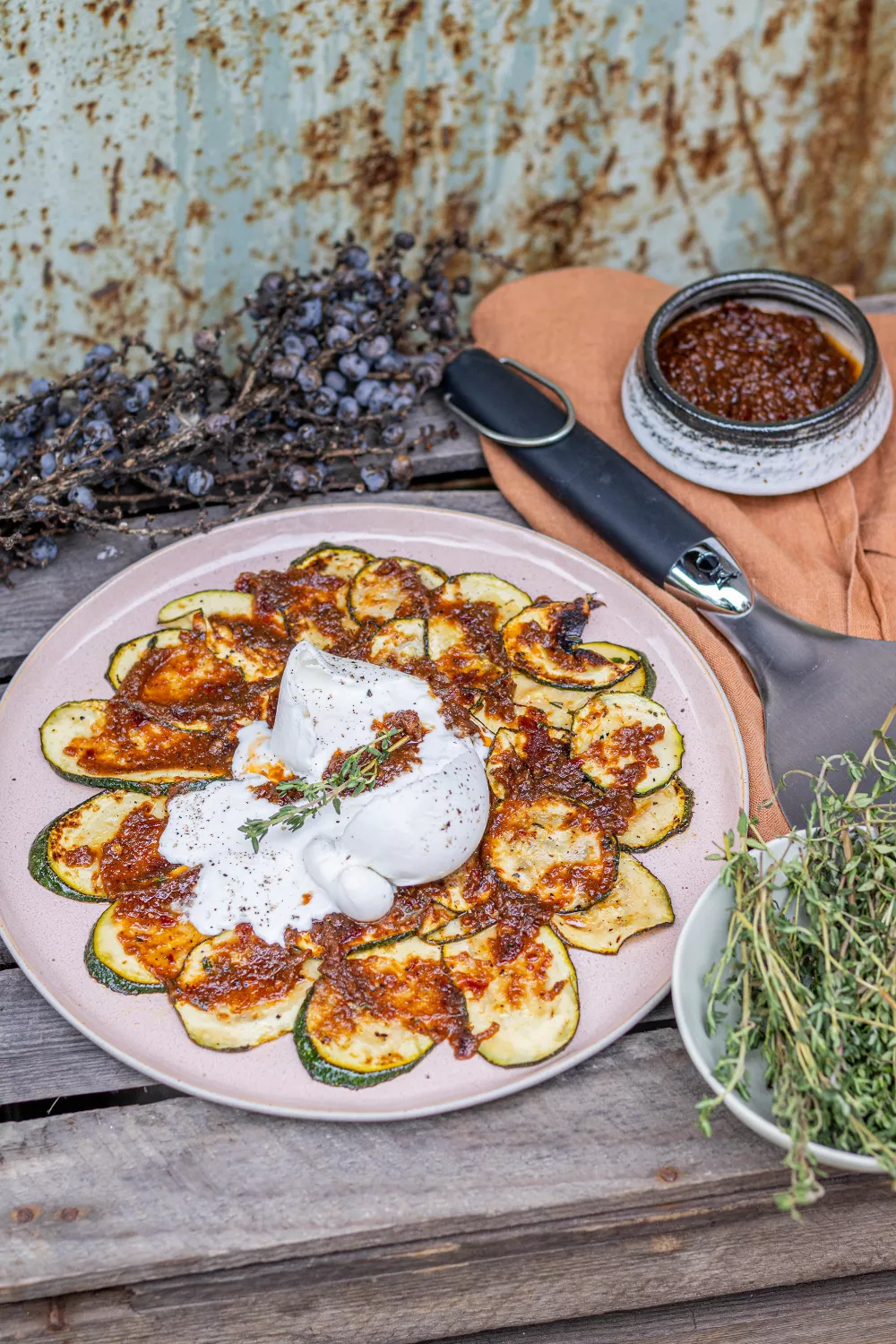 Deze carpaccio van courgette combineert dunne, gegrilde plakjes met een warm sausje van krokant gebakken knoflook, zongedroogde tomaat en zachte makreel en wordt afgewerkt met romige burrata. Het mediterrane voorgerecht op de plancha is ideaal voor een zomerse lunch of als elegant hapje tijdens een etentje in lente en zomer. Friszure citroen, verse tijm en olijfolie geven lichte, frisse smaken en een feestelijke maar ongedwongen sfeer.