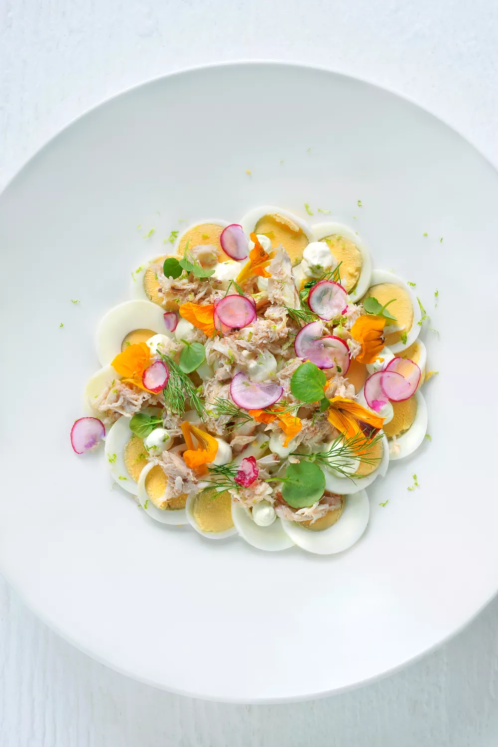 Deze carpaccio van ei en Noordzeekrab brengt zilte krab samen met romige hardgekookte eieren en frisse zeste van citroen en limoen voor een verfijnde, lichte smaak. Dunne eierschijfjes worden netjes opgelegd en overgoten met twee dressings van crème fraîche en mayonaise met currypoeder en een snufje cayenne, waarna krab, avocado, radijs en Oostindische kers het gerecht afwerken. Perfect als elegant voorgerecht of zomerse lunch voor liefhebbers van zeevruchten en eenvoudige, verfijnde keuken.