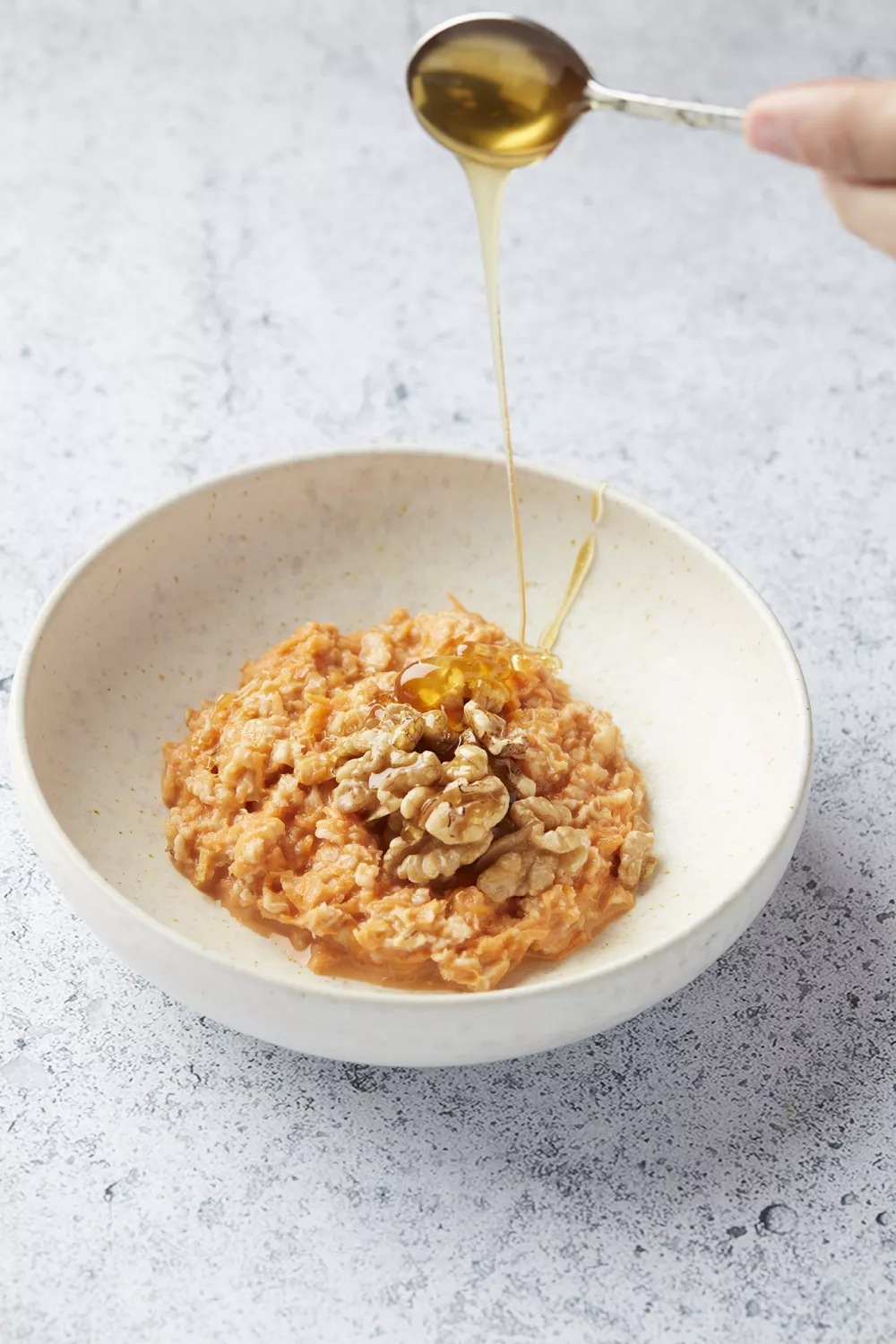 Deze carrot cake havermoutpap brengt de kruidige smaak van worteltaart naar je ontbijtbord met havervlokken, kaneel en knapperige walnoten. Snel op het vuur bereid met melk en wortelsap en afgewerkt met geraspte wortel en grofgehakte walnoten is het perfect voor een warm herfstontbijt of een gezellige brunch. Wie van zoet houdt voegt er nog een lepeltje honing aan toe.